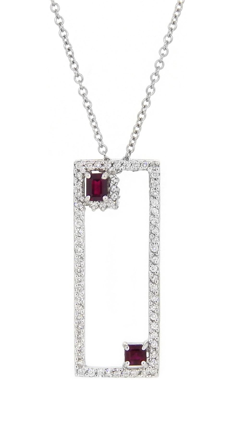 One 14KT White Gold 0.68ctw Ruby and Diamond Pendant with Chain. (2) Rubies with a total weight of 0.68cts. (66) Diamonds with a total weight of 0.60cts with a color of H-I and clarity of SI-2 to SI-3. Total weight of this pendant with chain is 8.1 grams.