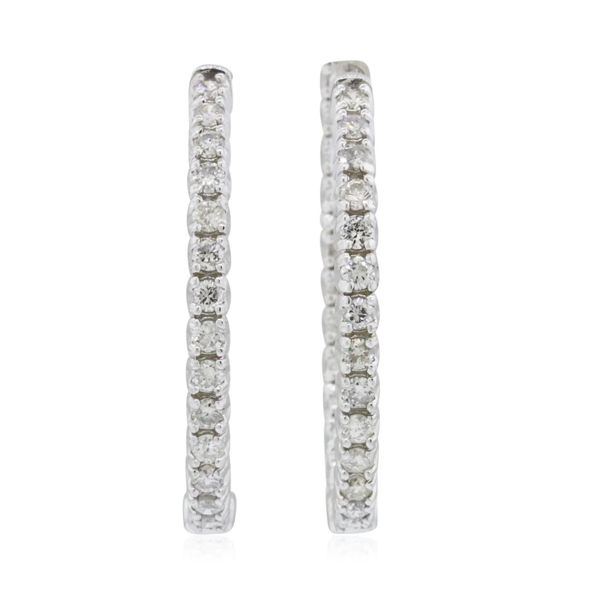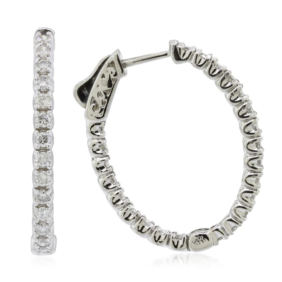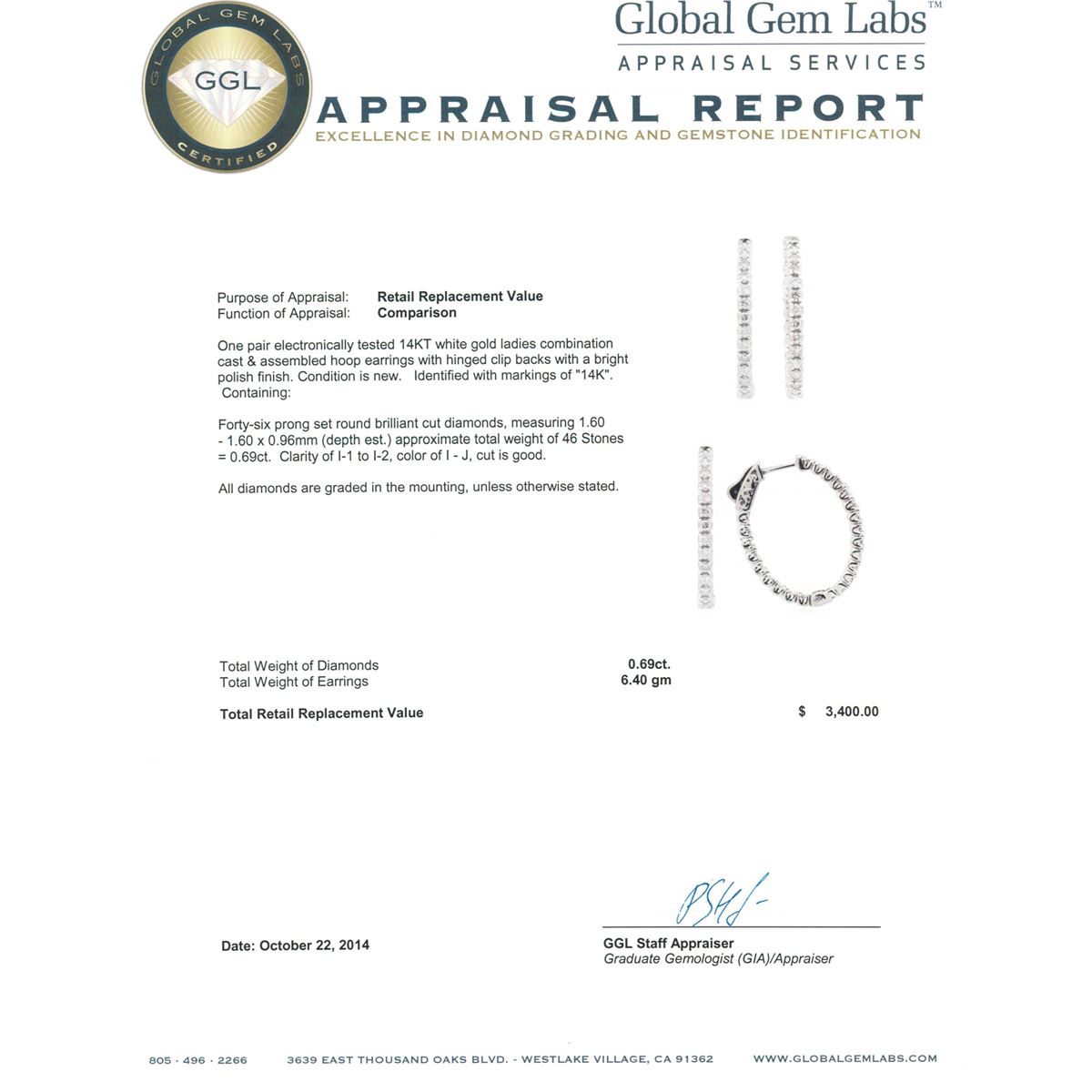 One pair electronically tested 14KT white gold ladies combination cast & assembled hoop earrings with hinged clip backs with a bright polish finish. Identified with markings of "14K". Condition is new. Containing: Forty-Six prong set round brilliant cut diamonds, measuring 1.60 - 1.60 x 0.96mm (depth est.) approximate total weight of 46 Stones = 0.69ct. Clarity: I-1 to I-2. Color: I - J, Cut is Good. All diamonds are graded in the mounting, unless otherwise stated. Total Weight of Diamonds 0.69ct. Total Weight of Earrings 6.40 grams. GGL Appraised at $3,400.00.