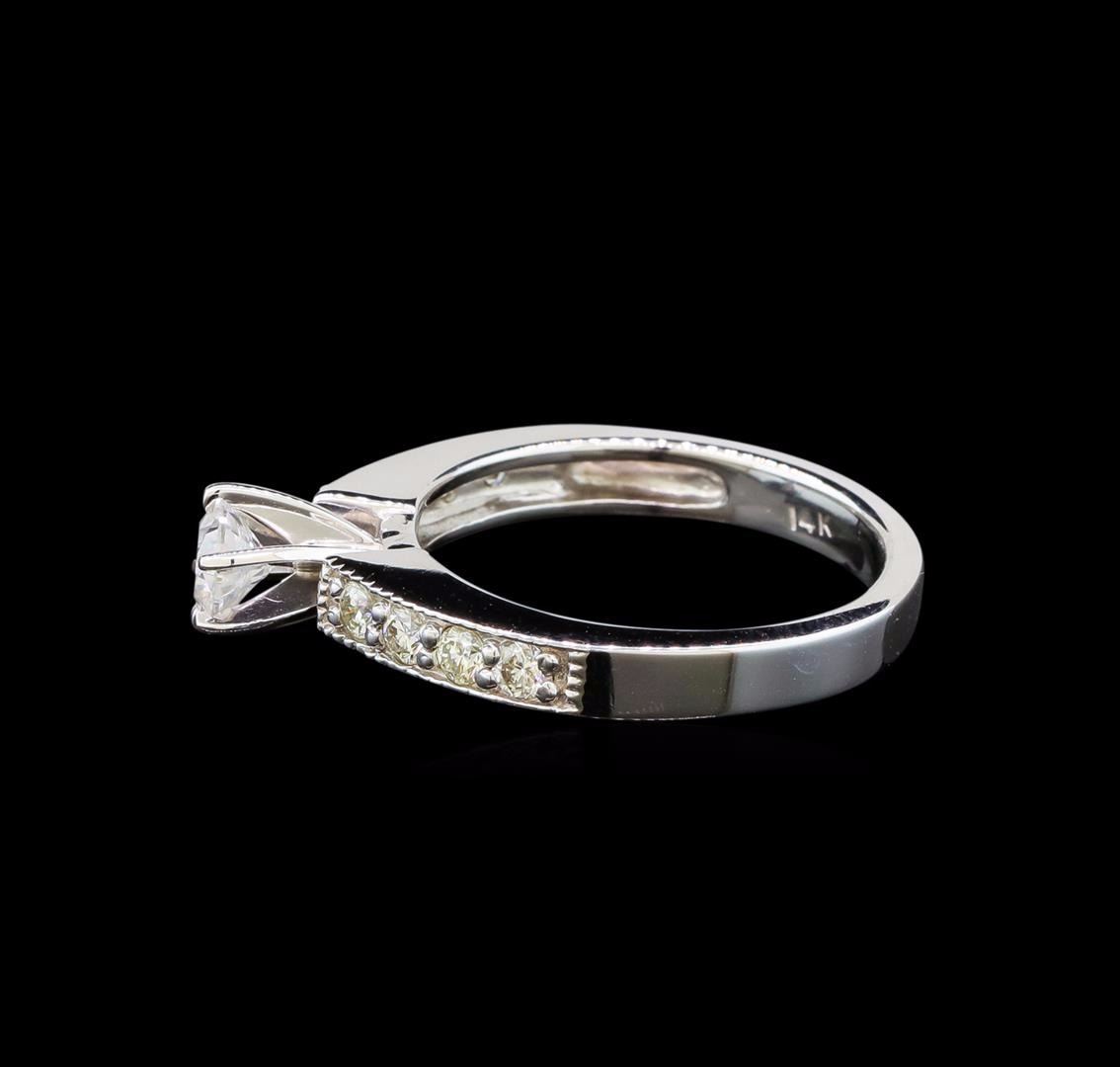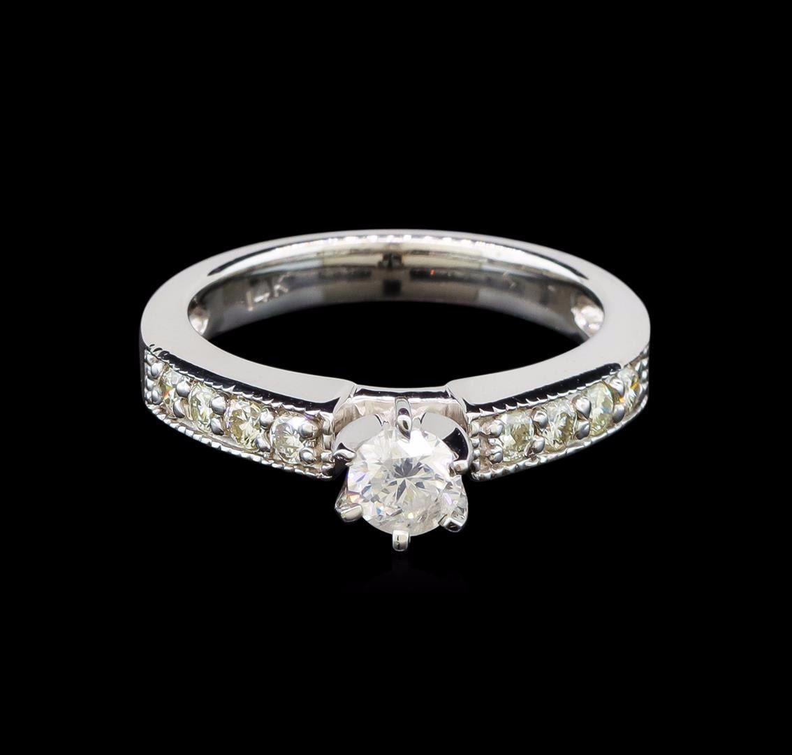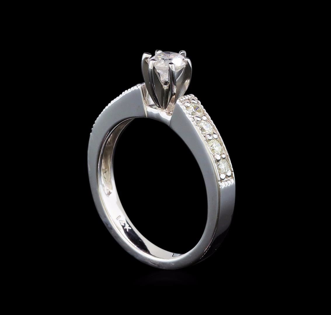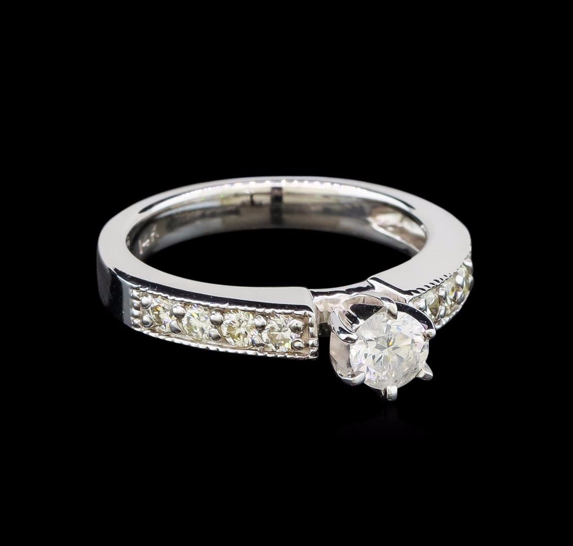 One electronically tested 14KT white gold ladies cast diamond unity ring. The featured diamond is supported by diamond set shoulders, completed by a two and one-half millimeter wide band. Bright polish finish with milgrain detailing. Identified with markings of "14K". Condition is new, good workmanship. Containing: One prong set round brilliant cut diamond, measuring 4.10 - 4.00 x 2.80mm (depth est.), 6.00.% GTCF approximate weight of 0.34ct. Graded in the setting. Clarity: I-1. Color: H. Depth 69.1%. Table 67.9%. Eight prong set round brilliant cut diamonds, measuring 2.30 - 2.20 x 1.35mm (depth est.) approximate total weight of 8 Stones = 0.35ct. Graded in the setting. Clarity: SI-2 to I-1. Color: I - K. Total Weight of Diamonds 0.69ct. Total Weight of Ring 4.41 grams. AIG Appraised at $2,700.00.