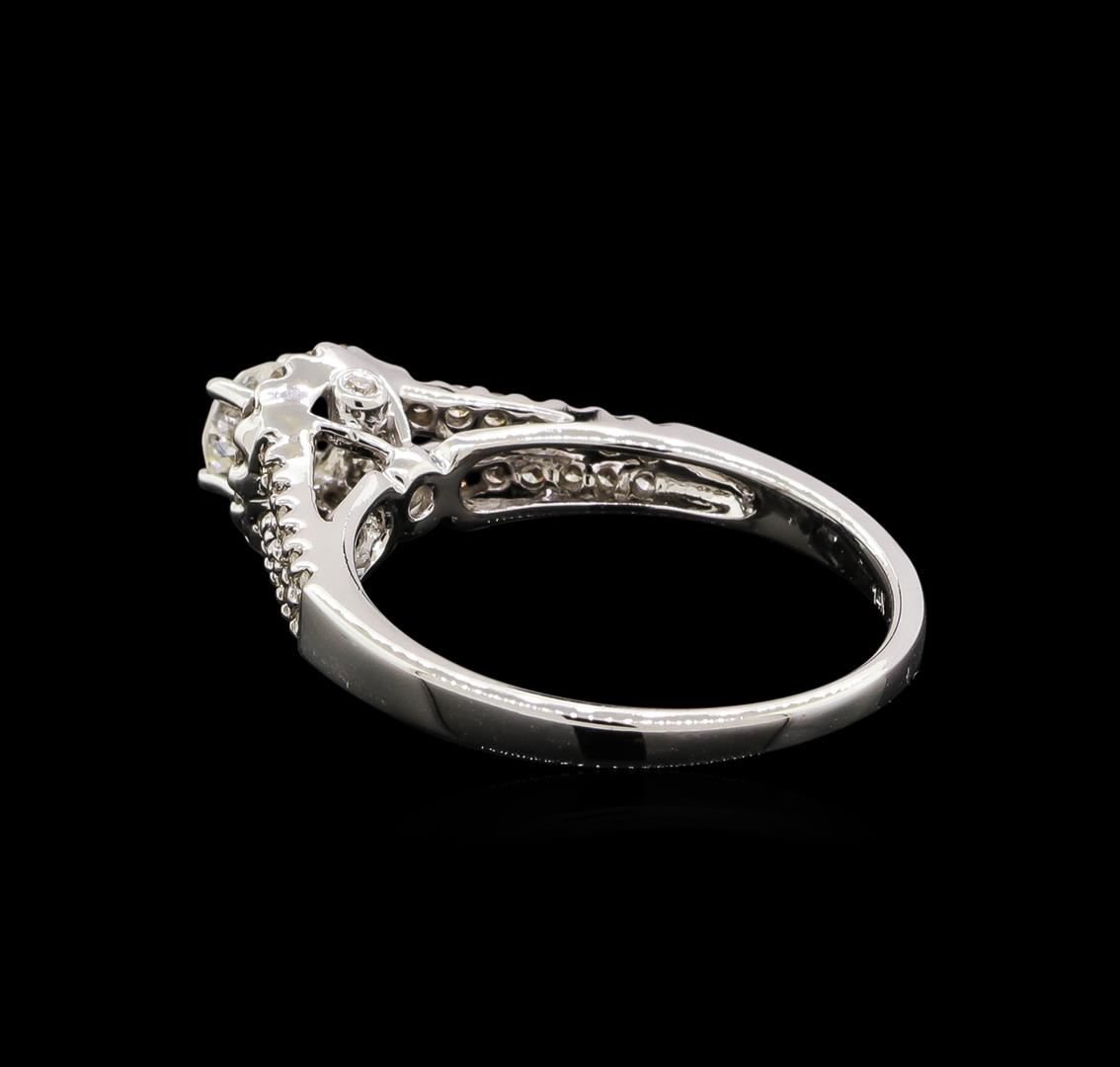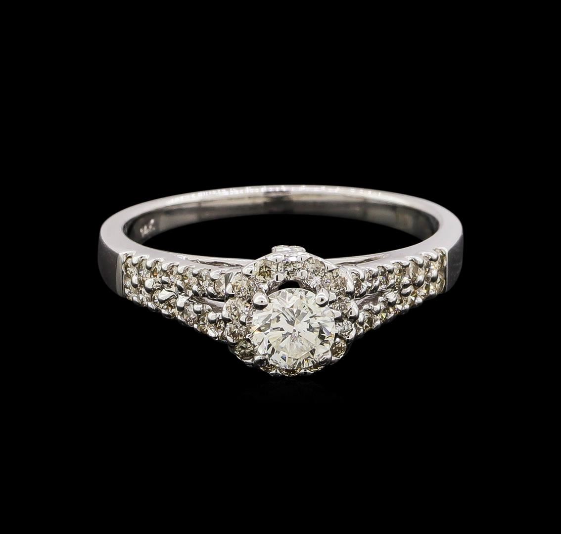 One electronically tested 14KT white gold ladies cast diamond engagement ring with a bright polish finish. Identified with markings of "14K". Condition is new. Containing: One prong set round brilliant cut diamond, measuring 4.50 - 4.50 x 2.70mm (depth est.) approximate weight of 0.33ct. Clarity: I-1. Color: K, Cut is Good. Forty-Four prong set round brilliant cut diamonds, measuring 1.30 - 1.30 x 0.78mm (depth est.) approximate total weight of 44 Stones = 0.35ct. Clarity: SI-1 to SI-2. Color: I, Cut is Good. All diamonds are graded in the mounting, unless otherwise stated. Total Weight of Diamonds 0.69ct. Total Weight of Engagement Ring 3.00 grams. GGL Appraised at $2,855.00.