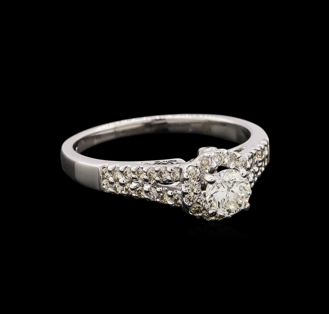 One electronically tested 14KT white gold ladies cast diamond engagement ring with a bright polish finish. Identified with markings of "14K". Condition is new. Containing: One prong set round brilliant cut diamond, measuring 4.50 - 4.50 x 2.70mm (depth est.) approximate weight of 0.33ct. Clarity: I-1. Color: K, Cut is Good. Forty-Four prong set round brilliant cut diamonds, measuring 1.30 - 1.30 x 0.78mm (depth est.) approximate total weight of 44 Stones = 0.35ct. Clarity: SI-1 to SI-2. Color: I, Cut is Good. All diamonds are graded in the mounting, unless otherwise stated. Total Weight of Diamonds 0.69ct. Total Weight of Engagement Ring 3.00 grams. GGL Appraised at $2,855.00.