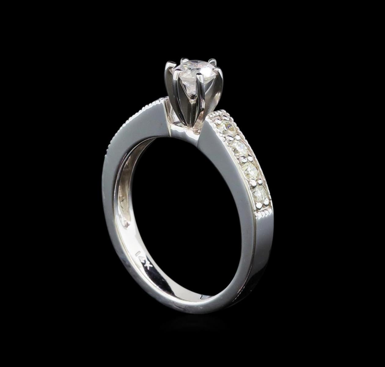 One electronically tested 14KT white gold ladies cast diamond unity ring. The featured diamond is supported by diamond set shoulders, completed by a two and one-half millimeter wide band. Bright polish finish with milgrain detailing. Identified with markings of "14K". Condition is new, good workmanship. Containing: One prong set round brilliant cut diamond, measuring 4.10 - 4.00 x 2.80mm (depth est.), 6.00.% GTCF approximate weight of 0.34ct. Graded in the setting. Clarity: I-1. Color: H. Depth 69.1%. Table 67.9%. Eight prong set round brilliant cut diamonds, measuring 2.30 - 2.20 x 1.35mm (depth est.) approximate total weight of 8 Stones = 0.35ct. Graded in the setting. Clarity: SI-2 to I-1. Color: I - K. Total Weight of Diamonds 0.69ct. Total Weight of Ring 4.41 grams. AIG Appraised.