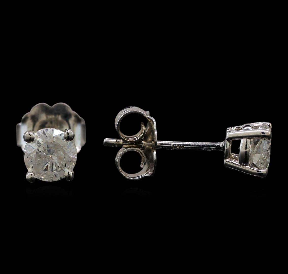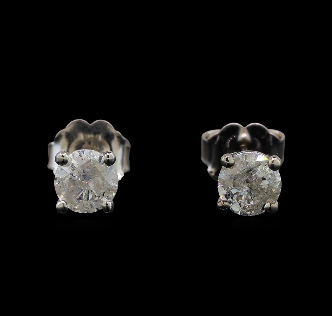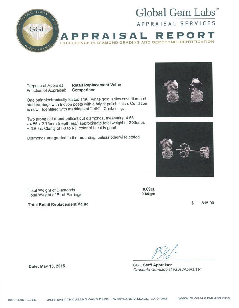One pair electronically tested 14KT white gold ladies cast diamond stud earrings with friction posts with a bright polish finish. Identified with markings of "14K". Condition is new. Containing: Two prong set round brilliant cut diamonds, measuring 4.55 - 4.55 x 2.75mm (depth est.) approximate total weight of 2 Stones = 0.69ct. Clarity: I-3 to I-3. Color: I, Cut is Good. Diamonds are graded in the mounting, unless otherwise stated. Total Weight of Diamonds 0.69ct. Total Weight of Stud Earrings 0.80 grams. GGL Appraised at $815.00.