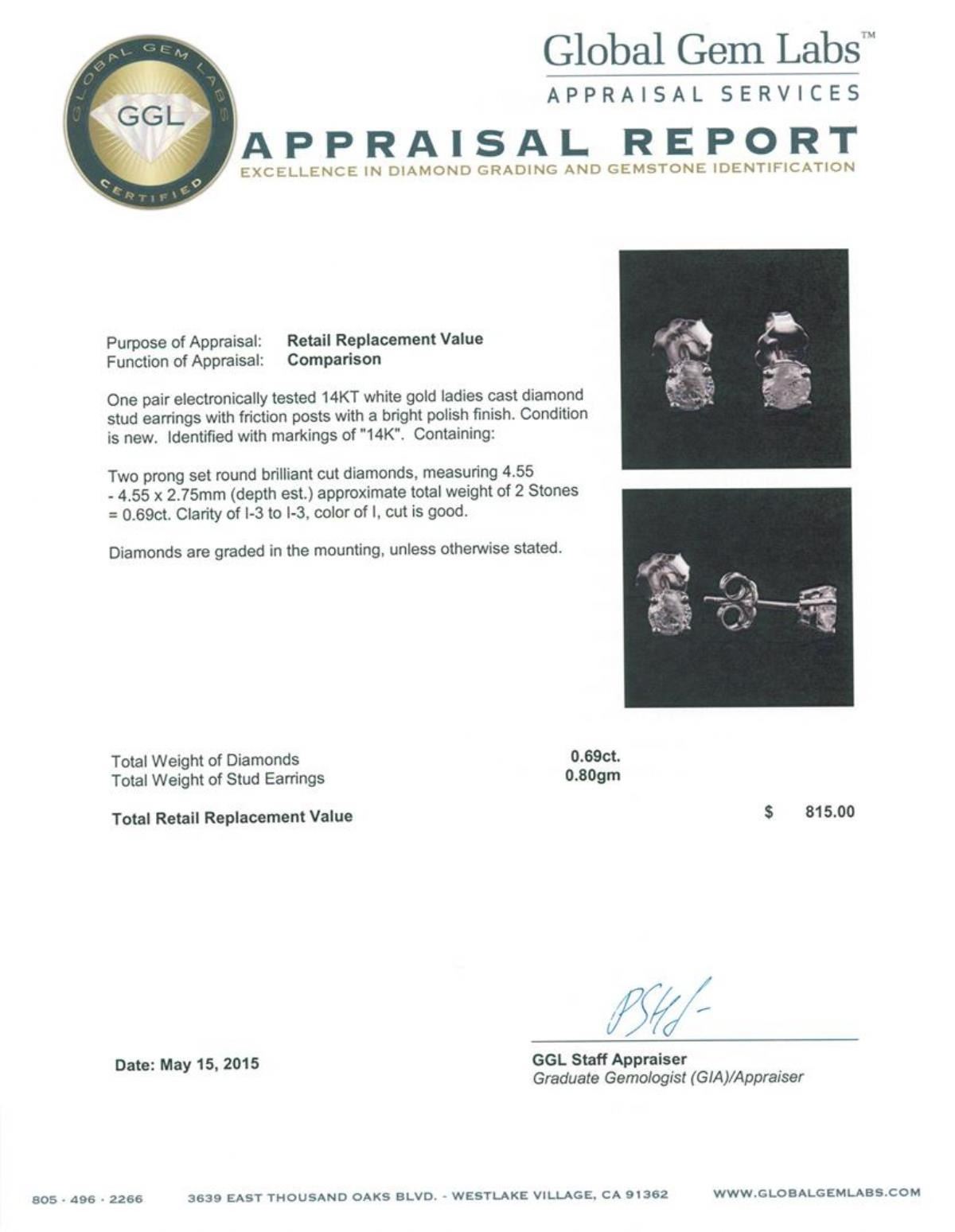 One pair electronically tested 14KT white gold ladies cast diamond stud earrings with friction posts with a bright polish finish. Identified with markings of "14K". Condition is new. Containing: Two prong set round brilliant cut diamonds, measuring 4.55 - 4.55 x 2.75mm (depth est.) approximate total weight of 2 Stones = 0.69ct. Clarity: I-3 to I-3. Color: I, Cut is Good. Diamonds are graded in the mounting, unless otherwise stated. Total Weight of Diamonds 0.69ct. Total Weight of Stud Earrings 0.80 grams. GGL Appraised.