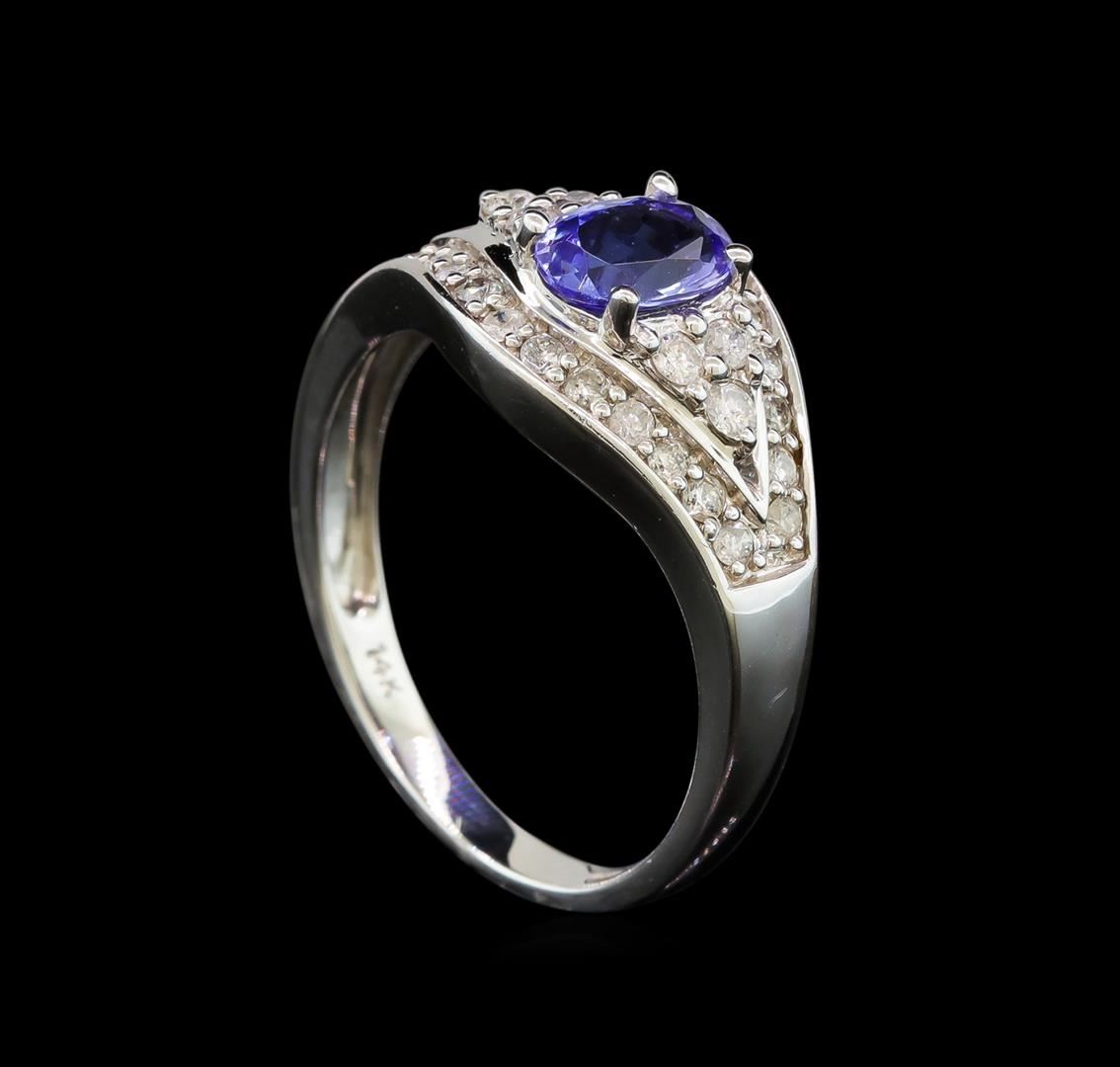 One electronically tested 14KT white gold ladies cast tanzanite and diamond ring with a bright polish finish. The featured tanzanite is supported by a diamond trio on either side and set within mirroring diamond ribbons, completed by a two and one-half millimeter wide band. Identified with markings of "14K". Condition is new, good workmanship. Containing: One prong set oval mixed cut natural tanzanite, measuring 6.80 x 4.80 x 2.90mm, 6% bulge factor, approximate weight of 0.69ct., clarity is slightly included, type I, medium light, very slightly grayish, bluish violet color, (GIA bV 4/3), cut is good. Transmitting light with no distortion, transparent. Graded in the setting. Tanzanite is a very rare gemstone that is only found in the country of Tanzania. Originally discovered in 1967. Tiffany & Company, named the stone Tanzanite. It is found in the Usumburu Mountains that border the Umba Valley of northern Tanzania. Tanzanite occurs in gray, brown, violet, blue, reddish-purple, & green. The gem is interesting because of its exceptional pleochroism. Rotated in different directions a tanzanite will exhibit multiple changes of color. Tanzanite has a low tolerance to ultrasonic cleaning, and should not be cleaned using this method. Thirty prong set round brilliant cut diamonds, measuring 1.80 - 1.60 x 1.02mm (depth est.) approximate total weight of 30 Stones = 0.63ct. Graded in the setting. Clarity: I-1 to I-2. Color: H - J. Total Weight of Colored Stones 0.69ct. Total Weight of Diamonds 0.63ct. Total Weight of Ring 3.47 grams. AIG Appraised at $2,560.00.