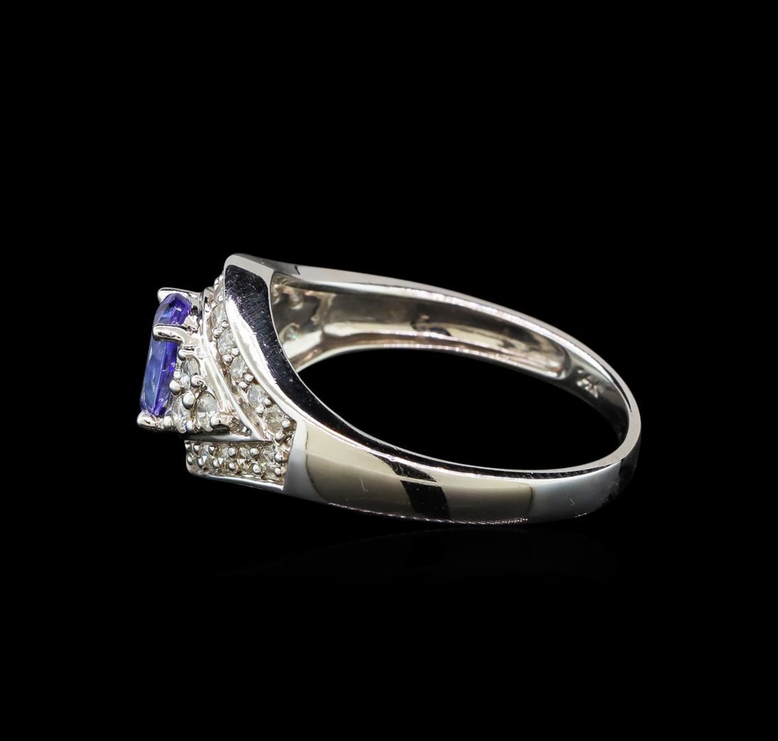One electronically tested 14KT white gold ladies cast tanzanite and diamond ring with a bright polish finish. The featured tanzanite is supported by a diamond trio on either side and set within mirroring diamond ribbons, completed by a two and one-half millimeter wide band. Identified with markings of "14K". Condition is new, good workmanship. Containing: One prong set oval mixed cut natural tanzanite, measuring 6.80 x 4.80 x 2.90mm, 6% bulge factor, approximate weight of 0.69ct., clarity is slightly included, type I, medium light, very slightly grayish, bluish violet color, (GIA bV 4/3), cut is good. Transmitting light with no distortion, transparent. Graded in the setting. Tanzanite is a very rare gemstone that is only found in the country of Tanzania. Originally discovered in 1967. Tiffany & Company, named the stone Tanzanite. It is found in the Usumburu Mountains that border the Umba Valley of northern Tanzania. Tanzanite occurs in gray, brown, violet, blue, reddish-purple, & green. The gem is interesting because of its exceptional pleochroism. Rotated in different directions a tanzanite will exhibit multiple changes of color. Tanzanite has a low tolerance to ultrasonic cleaning, and should not be cleaned using this method. Thirty prong set round brilliant cut diamonds, measuring 1.80 - 1.60 x 1.02mm (depth est.) approximate total weight of 30 Stones = 0.63ct. Graded in the setting. Clarity: I-1 to I-2. Color: H - J. Total Weight of Colored Stones 0.69ct. Total Weight of Diamonds 0.63ct. Total Weight of Ring 3.47 grams. AIG Appraised at $2,560.00.