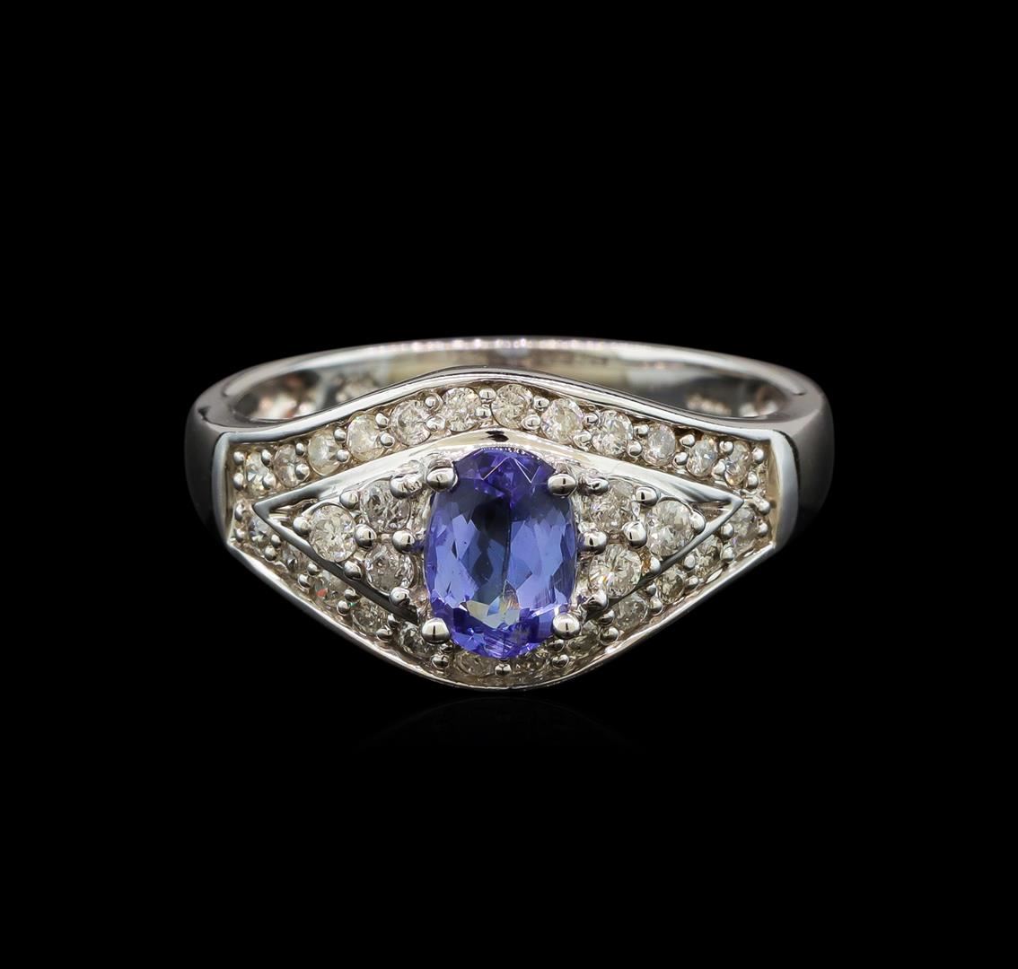 One electronically tested 14KT white gold ladies cast tanzanite and diamond ring with a bright polish finish. The featured tanzanite is supported by a diamond trio on either side and set within mirroring diamond ribbons, completed by a two and one-half millimeter wide band. Identified with markings of "14K". Condition is new, good workmanship. Containing: One prong set oval mixed cut natural tanzanite, measuring 6.80 x 4.80 x 2.90mm, 6% bulge factor, approximate weight of 0.69ct., clarity is slightly included, type I, medium light, very slightly grayish, bluish violet color, (GIA bV 4/3), cut is good. Transmitting light with no distortion, transparent. Graded in the setting. Tanzanite is a very rare gemstone that is only found in the country of Tanzania. Originally discovered in 1967. Tiffany & Company, named the stone Tanzanite. It is found in the Usumburu Mountains that border the Umba Valley of northern Tanzania. Tanzanite occurs in gray, brown, violet, blue, reddish-purple, & green. The gem is interesting because of its exceptional pleochroism. Rotated in different directions a tanzanite will exhibit multiple changes of color. Tanzanite has a low tolerance to ultrasonic cleaning, and should not be cleaned using this method. Thirty prong set round brilliant cut diamonds, measuring 1.80 - 1.60 x 1.02mm (depth est.) approximate total weight of 30 Stones = 0.63ct. Graded in the setting. Clarity: I-1 to I-2. Color: H - J. Total Weight of Colored Stones 0.69ct. Total Weight of Diamonds 0.63ct. Total Weight of Ring 3.47 grams. AIG Appraised at $2,560.00.