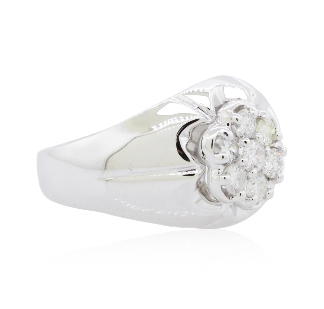 One electronically tested 14KT white gold unisex combination cast & assembled diamond ring with a bright polish finish. Identified with markings of "14K". Condition is new. Containing: Seven prong set round brilliant cut diamonds, measuring 3.00 - 3.00 x 1.80mm (depth est.) approximate total weight of 7 Stones = 0.69ct. Clarity: SI-2 to I-1. Color: J - K, Cut is Good. All diamonds are graded in the mounting, unless otherwise stated. Total Weight of Diamonds 0.69ct. Total Weight of Ring 7.70 grams. GGL Appraised at $3,195.00.