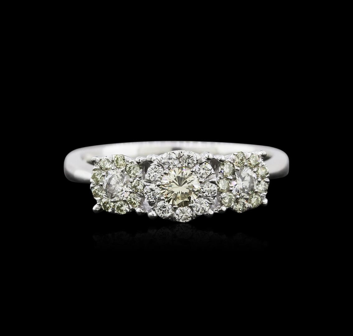 One electronically tested 14KT white gold ladies cast diamond ring with a bright polish finish. Identified with markings of "14K". Condition is new. Containing: One prong set round brilliant cut diamond, measuring 3.50 - 3.50 x 0.00mm (depth est.) approximate weight of 0.18ct. Clarity: SI-1, Cut is Good. Two prong set round brilliant cut diamonds, measuring 3.00 - 3.00 x 1.80mm (depth est.) approximate total weight of 2 Stones = 0.18ct. Clarity: I-1. Color: G - H, Cut is Good. Eighteen prong set round brilliant cut diamonds, measuring 1.30 - 1.30 x 0.78mm (depth est.) approximate total weight of 18 Stones = 0.19ct. Clarity: SI-1 to I-1. Nine prong set round brilliant cut diamonds, measuring 1.50 - 1.50 x 0.90mm (depth est.) approximate total weight of 9 Stones = 0.15ct. Clarity: SI-1 to I-1. Color: G - H, Cut is Good. Diamonds are graded in the mounting, unless otherwise stated. Total Weight of Diamonds 0.70ct. Total Weight of Ring 3.50 grams. GGL Appraised at $2,165.00.
