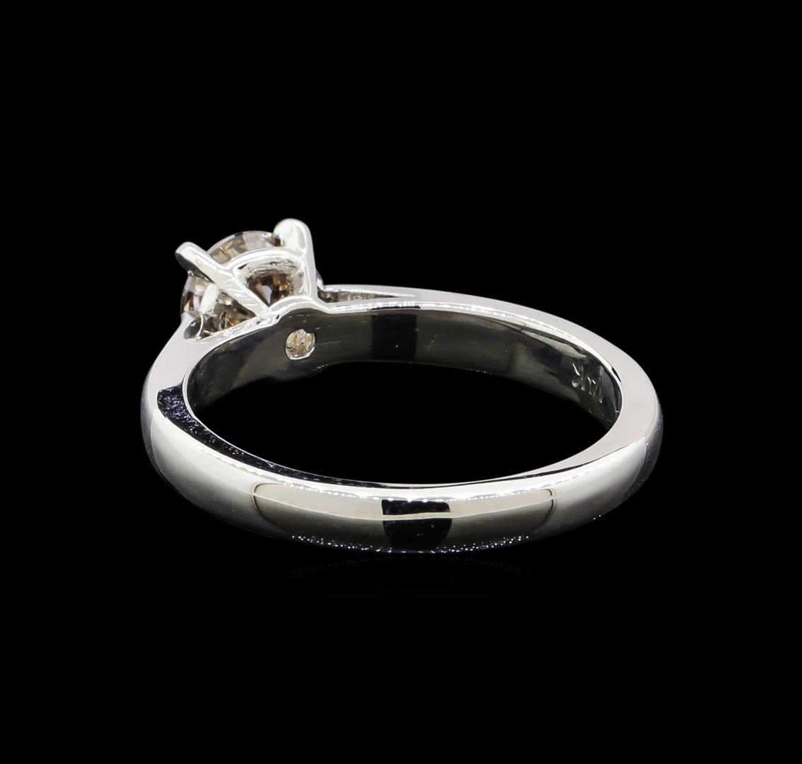 One electronically tested 14KT white gold ladies cast diamond solitaire ring with a flat shank with rounded edges with a bright polish finish. Identified with markings of "14K". Condition is new. Containing: One prong set round brilliant cut diamond, measuring 5.60 - 5.60 x 3.36mm (depth est.) exact weight 0.70ct. Clarity: I-1, Cut is Good. Diamonds are graded in the mounting, unless otherwise stated. Total Weight of Diamonds 0.70ct. Total Weight of Solitaire Ring 3.60 grams. GGL Appraised at $1,560.00.