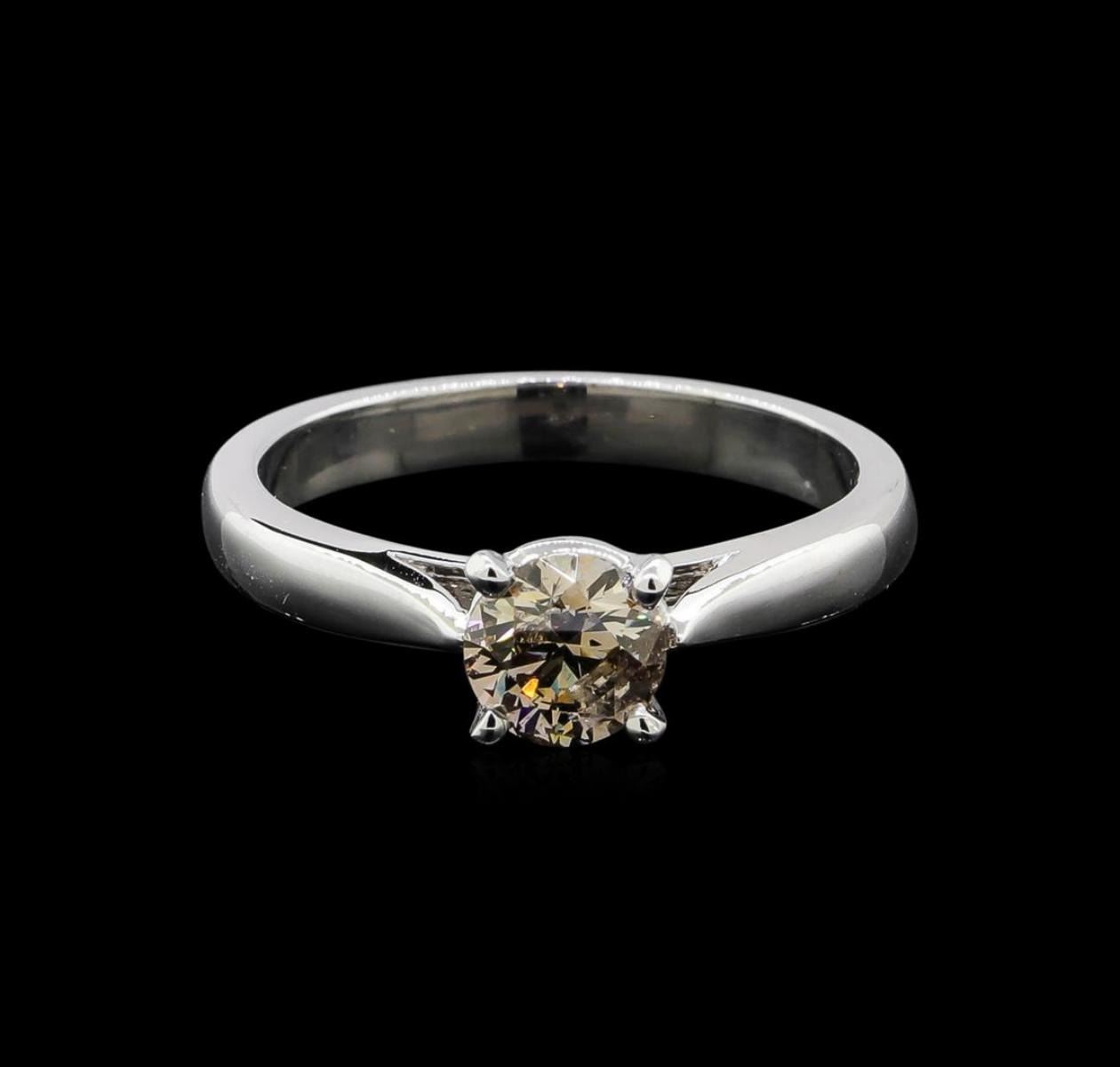 One electronically tested 14KT white gold ladies cast diamond solitaire ring with a flat shank with rounded edges with a bright polish finish. Identified with markings of "14K". Condition is new. Containing: One prong set round brilliant cut diamond, measuring 5.60 - 5.60 x 3.36mm (depth est.) exact weight 0.70ct. Clarity: I-1, Cut is Good. Diamonds are graded in the mounting, unless otherwise stated. Total Weight of Diamonds 0.70ct. Total Weight of Solitaire Ring 3.60 grams. GGL Appraised at $1,560.00.