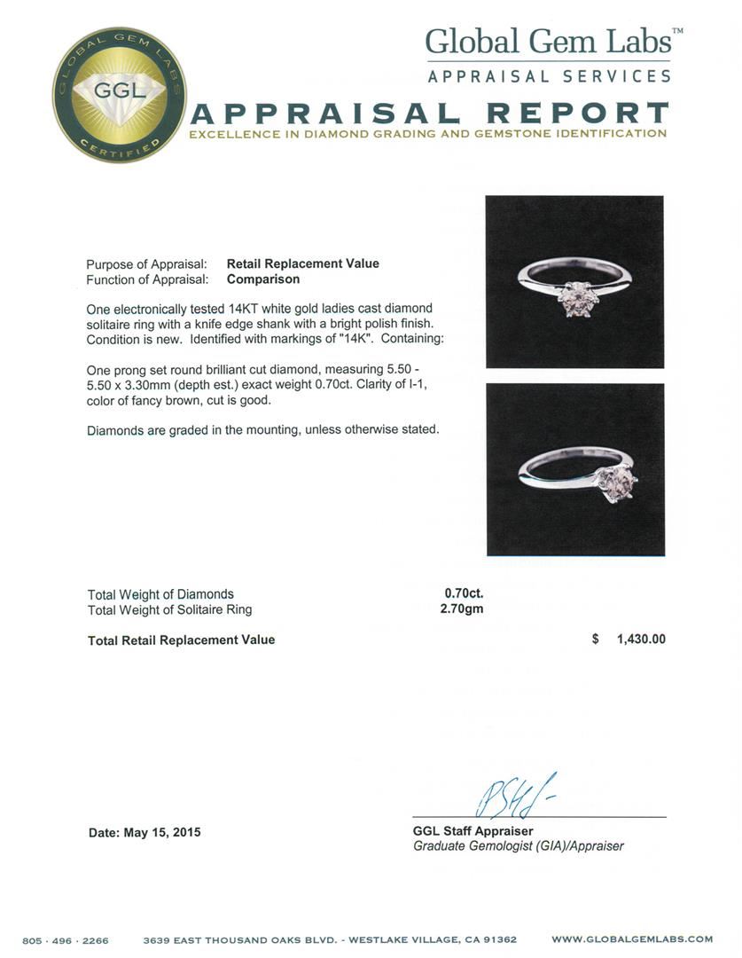 One electronically tested 14KT white gold ladies cast diamond solitaire ring with a knife edge shank with a bright polish finish. Identified with markings of "14K". Condition is new. Containing: One prong set round brilliant cut diamond, measuring 5.50 - 5.50 x 3.30mm (depth est.) exact weight 0.70ct. Clarity: I-1, Cut is Good. Diamonds are graded in the mounting, unless otherwise stated. Total Weight of Diamonds 0.70ct. Total Weight of Solitaire Ring 2.70 grams. GGL Appraised.