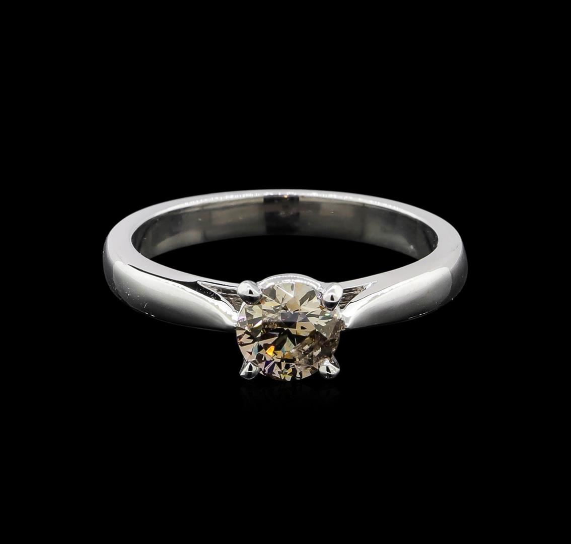 One electronically tested 14KT white gold ladies cast diamond solitaire ring with a flat shank with rounded edges with a bright polish finish. Identified with markings of "14K". Condition is new. Containing: One prong set round brilliant cut diamond, measuring 5.60 - 5.60 x 3.36mm (depth est.) exact weight 0.70ct. Clarity: I-1, Cut is Good. Diamonds are graded in the mounting, unless otherwise stated. Total Weight of Diamonds 0.70ct. Total Weight of Solitaire Ring 3.60 grams. GGL Appraised.