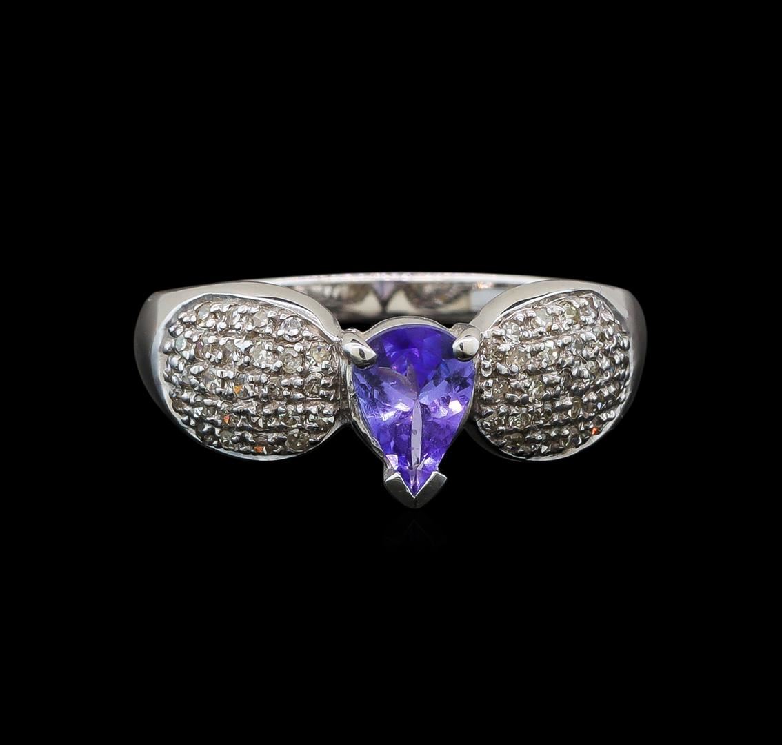 One electronically tested 14KT white gold ladies cast tanzanite and diamond ring with a bright polish finish. Identified with markings of "14K". Condition is new. Containing: One prong set pear modified brilliant cut natural tanzanite, measuring 6.40 x 5.00 x 3.25mm, approximate weight of 0.70 ct., clarity is eye clean, type I, medium light, very slightly grayish, violet color, (GIA V 4/3), cut is good. Fifty-Four prong set single cut diamonds, measuring 1.00 - 1.00 x 0.60mm (depth est.) approximate total weight of 54 Stones = 0.19ct. Clarity: I-1 to I-2. Color: I - J. Colored gemstones are presumed to have been subjected to commonly used enhancement processes. All diamonds and colored gemstones are graded in the mounting, unless otherwise stated. Total Weight of Colored Stones 0.70 ct. Total Weight of Diamonds 0.19ct. Total Weight of Ring 3.90 grams. GGL Appraised.