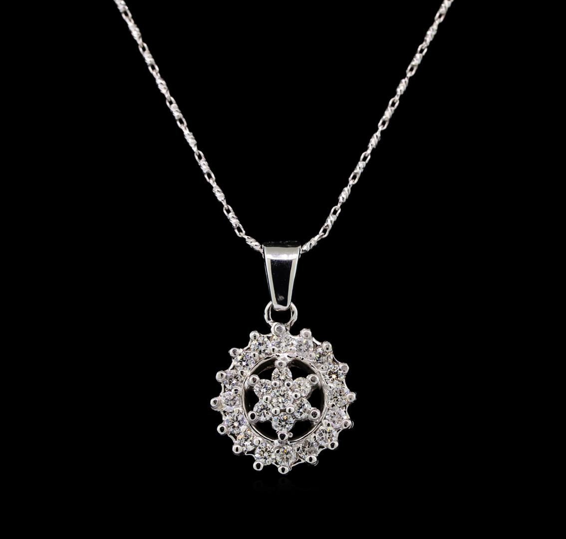 One electronically tested 14KT white gold ladies cast diamond pendant & chain 18.0" long, with a spring ring clasp with a bright polish finish. Identified with markings of "14K". Condition is new. Containing: Twenty-Three prong set round brilliant cut diamonds, measuring 2.00 - 2.00 x 1.20mm (depth est.) approximate total weight of 23 Stones = 0.71ct. Clarity: SI-1 to SI-2. Color: I - J, Cut is Good. All diamonds are graded in the mounting, unless otherwise stated. Total Weight of Diamonds 0.71ct. Total Weight of Pendant & Chain 5.36 grams. GGL Appraised at $2,440.00.