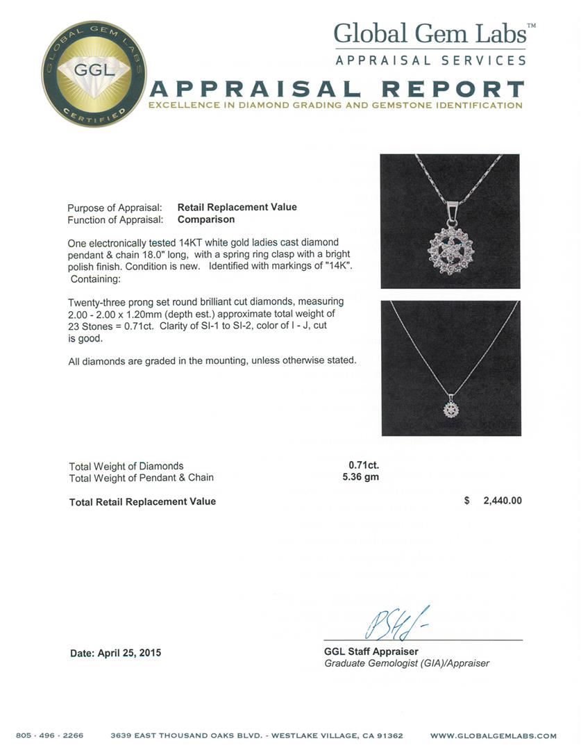 One electronically tested 14KT white gold ladies cast diamond pendant & chain 18.0" long, with a spring ring clasp with a bright polish finish. Identified with markings of "14K". Condition is new. Containing: Twenty-Three prong set round brilliant cut diamonds, measuring 2.00 - 2.00 x 1.20mm (depth est.) approximate total weight of 23 Stones = 0.71ct. Clarity: SI-1 to SI-2. Color: I - J, Cut is Good. All diamonds are graded in the mounting, unless otherwise stated. Total Weight of Diamonds 0.71ct. Total Weight of Pendant & Chain 5.36 grams. GGL Appraised at $2,440.00.