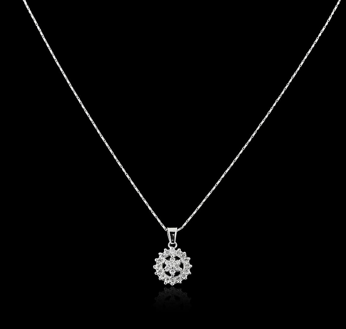 One electronically tested 14KT white gold ladies cast diamond pendant & chain 18.0" long, with a spring ring clasp with a bright polish finish. Identified with markings of "14K". Condition is new. Containing: Twenty-Three prong set round brilliant cut diamonds, measuring 2.00 - 2.00 x 1.20mm (depth est.) approximate total weight of 23 Stones = 0.71ct. Clarity: SI-1 to SI-2. Color: I - J, Cut is Good. All diamonds are graded in the mounting, unless otherwise stated. Total Weight of Diamonds 0.71ct. Total Weight of Pendant & Chain 5.36 grams. GGL Appraised at $2,440.00.