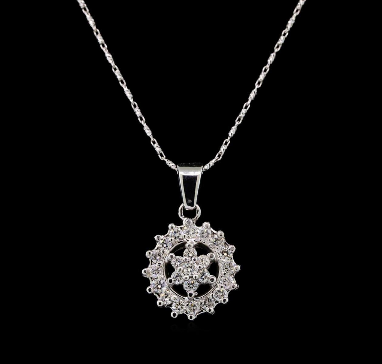 One electronically tested 14KT white gold ladies cast diamond pendant & chain 18.0" long, with a spring ring clasp with a bright polish finish. Identified with markings of "14K". Condition is new. Containing: Twenty-Three prong set round brilliant cut diamonds, measuring 2.00 - 2.00 x 1.20mm (depth est.) approximate total weight of 23 Stones = 0.71ct. Clarity: SI-1 to SI-2. Color: I - J, Cut is Good. All diamonds are graded in the mounting, unless otherwise stated. Total Weight of Diamonds 0.71ct. Total Weight of Pendant & Chain 5.36 grams. GGL Appraised.