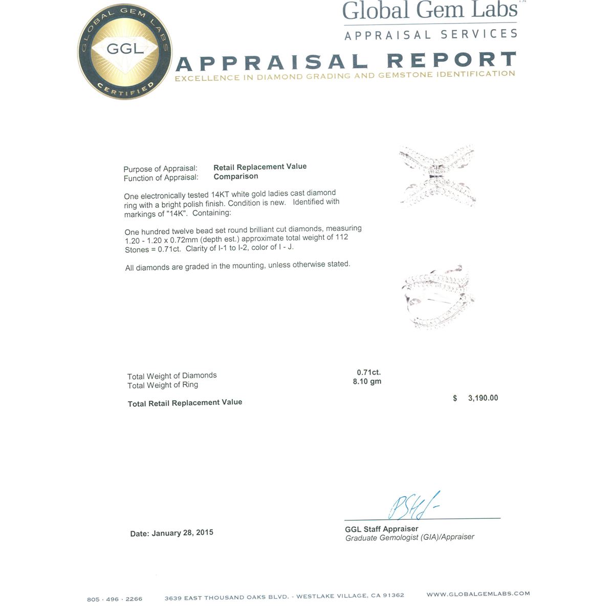 One electronically tested 14KT white gold ladies cast diamond ring with a bright polish finish. Identified with markings of "14K". Condition is new. Containing: One Hundred Twelve bead set round brilliant cut diamonds, measuring 1.20 - 1.20 x 0.72mm (depth est.) approximate total weight of 112 Stones = 0.71ct. Clarity: I-1 to I-2. Color: I - J. All diamonds are graded in the mounting, unless otherwise stated. Total Weight of Diamonds 0.71ct. Total Weight of Ring 8.10 grams. GGL Appraised at $3,190.00.