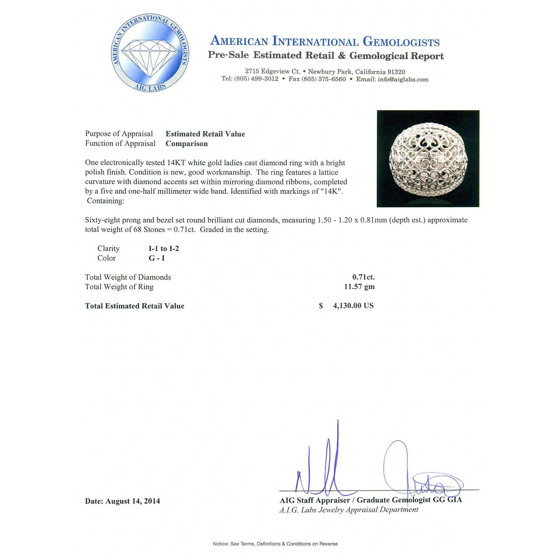 One electronically tested 14KT white gold ladies cast diamond ring with a bright polish finish. Condition is new, good workmanship. The ring features a lattice curvature with diamond accents set within mirroring diamond ribbons, completed by a five and one-half millimeter wide band. Identified with markings of "14K". Containing: Sixty-Eight prong and bezel set round brilliant cut diamonds, measuring 1.50 - 1.20 x 0.81mm (depth est.) approximate. Total Weight of 68 Stones = 0.71ct. Graded in the setting. Clarity: I-1 to I-2. Color: G - I. Total Weight of Diamonds 0.71ct. Total Weight of Ring 11.57gm. AIG Appraised at $4,130.00.