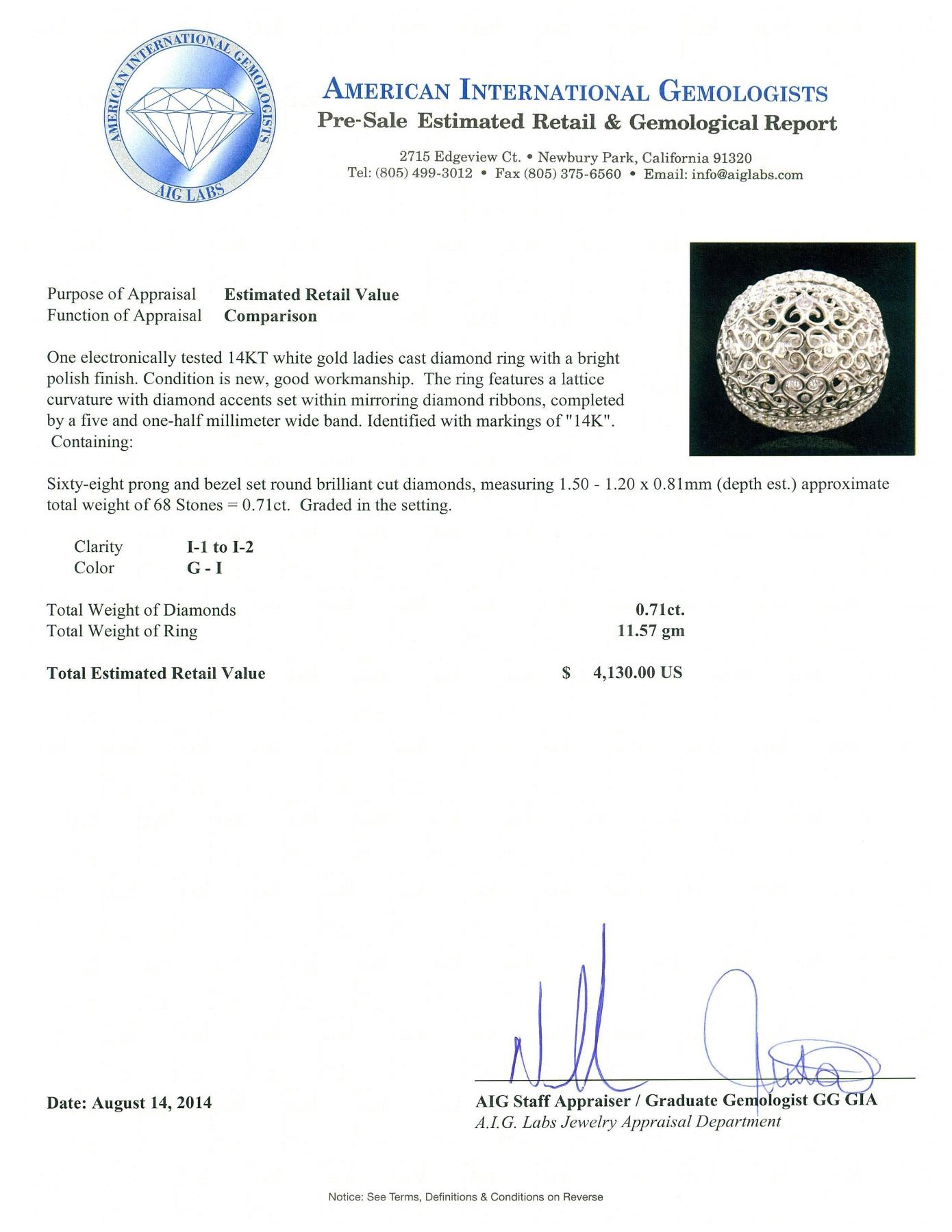 One electronically tested 14KT white gold ladies cast diamond ring with a bright polish finish. Condition is new, good workmanship. The ring features a lattice curvature with diamond accents set within mirroring diamond ribbons, completed by a five and one-half millimeter wide band. Identified with markings of "14K". Containing: Sixty-Eight prong and bezel set round brilliant cut diamonds, measuring 1.50 - 1.20 x 0.81mm (depth est.) approximate. Total Weight of 68 Stones = 0.71ct. Graded in the setting. Clarity: I-1 to I-2. Color: G - I. Total Weight of Diamonds 0.71ct. Total Weight of Ring 11.57gm. AIG Appraised.