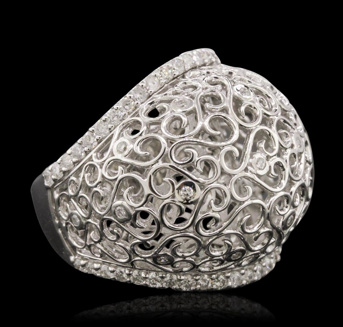 One electronically tested 14KT white gold ladies cast diamond ring with a bright polish finish. Condition is new, good workmanship. The ring features a lattice curvature with diamond accents set within mirroring diamond ribbons, completed by a five and one-half millimeter wide band. Identified with markings of "14K". Containing: Sixty-Eight prong and bezel set round brilliant cut diamonds, measuring 1.50 - 1.20 x 0.81mm (depth est.) approximate. Total Weight of 68 Stones = 0.71ct. Graded in the setting. Clarity: I-1 to I-2. Color: G - I. Total Weight of Diamonds 0.71ct. Total Weight of Ring 11.57gm. AIG Appraised.