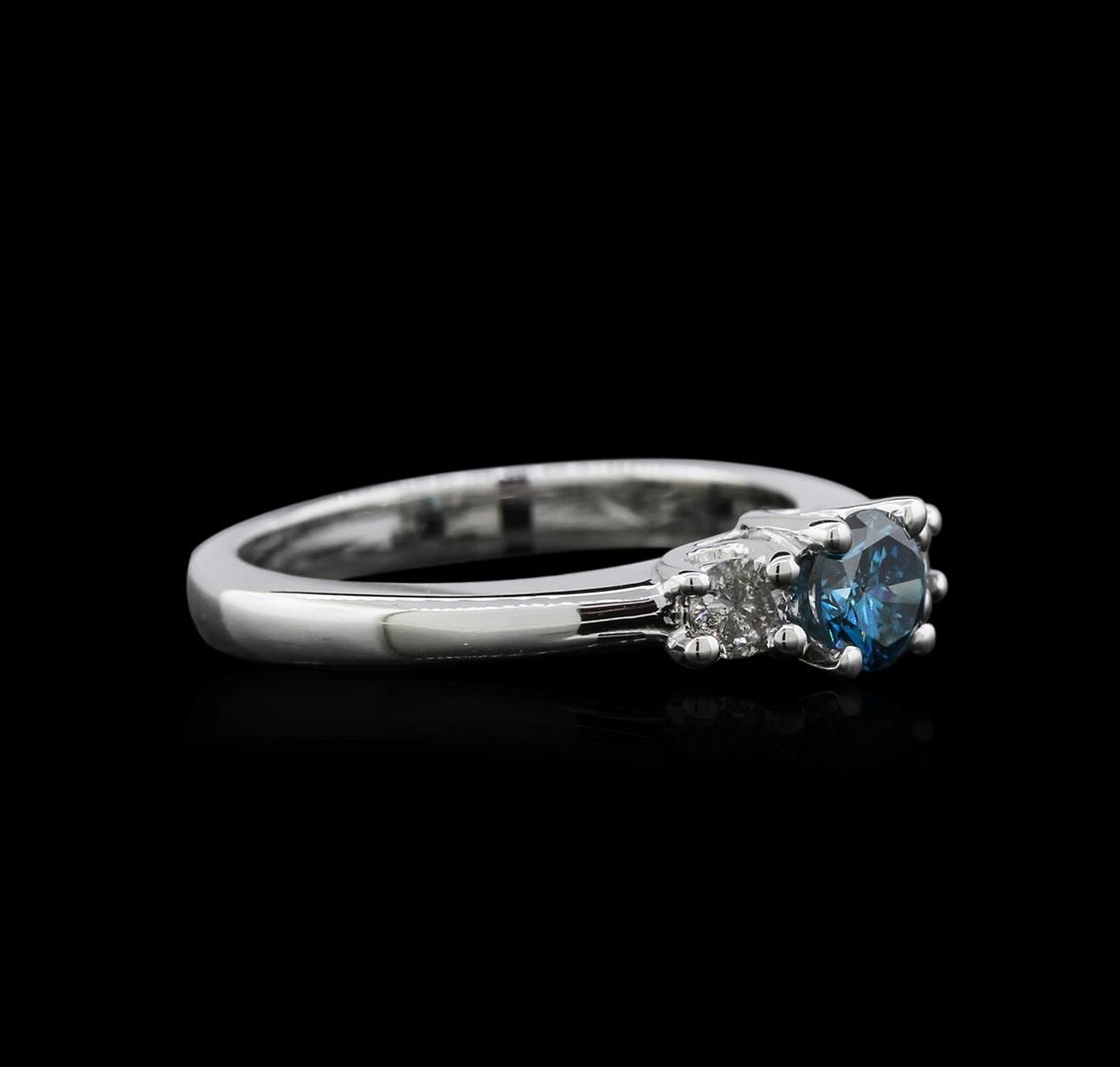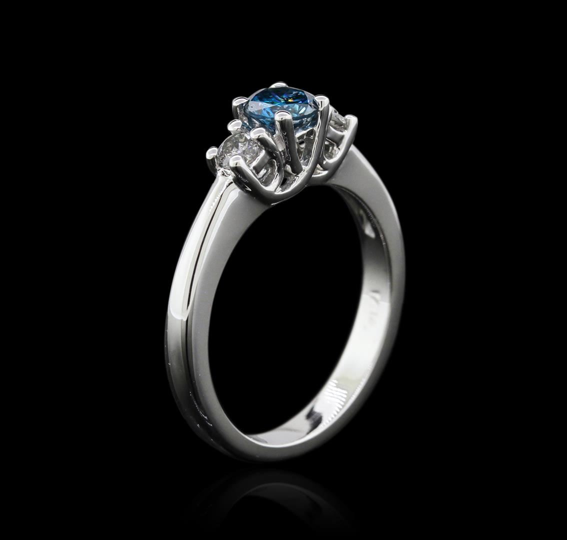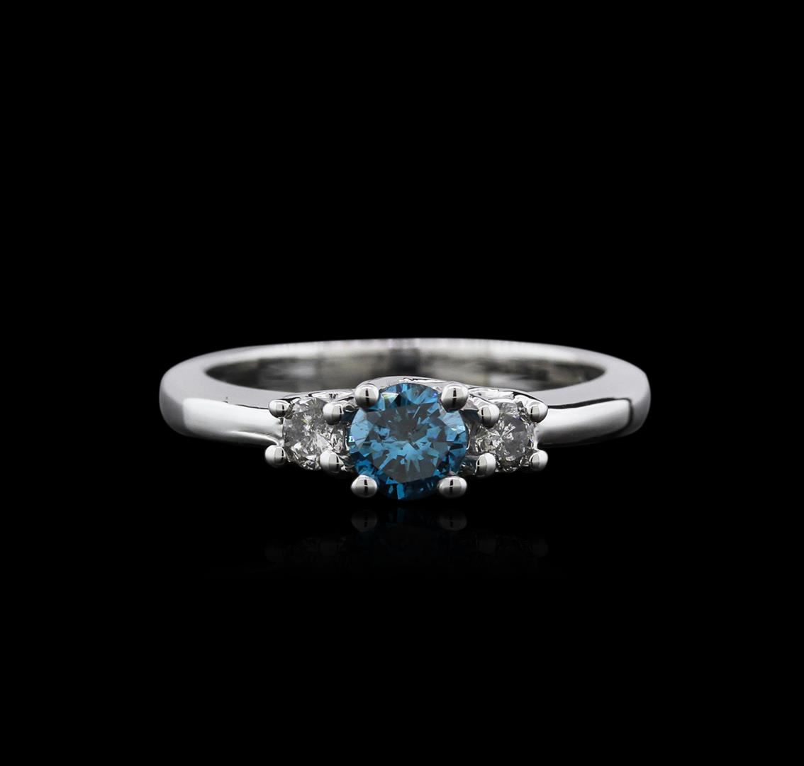 One ring featuring: 14KT white gold weighing 4.20 grams containing one blue diamond center stone with a total weight of 0.46ct and two side diamonds with a total weight of 0.25ct.