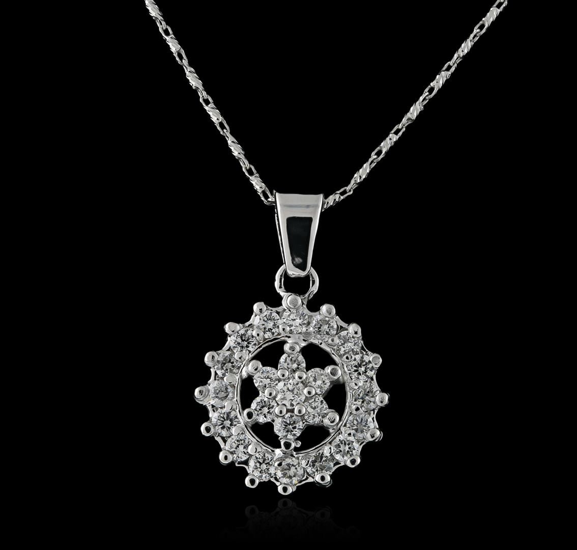 One electronically tested 14KT white gold ladies cast diamond pendant & chain 18.0" long, with a spring ring clasp with a bright polish finish. Identified with markings of "14K". Condition is new. Containing: Twenty-Three prong set round brilliant cut diamonds, measuring 2.00 - 2.00 x 1.20mm (depth est.) approximate total weight of 23 Stones = 0.71ct. Clarity: SI-1 to SI-2. Color: I - J, Cut is Good. All diamonds are graded in the mounting, unless otherwise stated. Total Weight of Diamonds 0.71ct. Total Weight of Pendant & Chain 5.36 grams. GGL Appraised at $2,440.00.