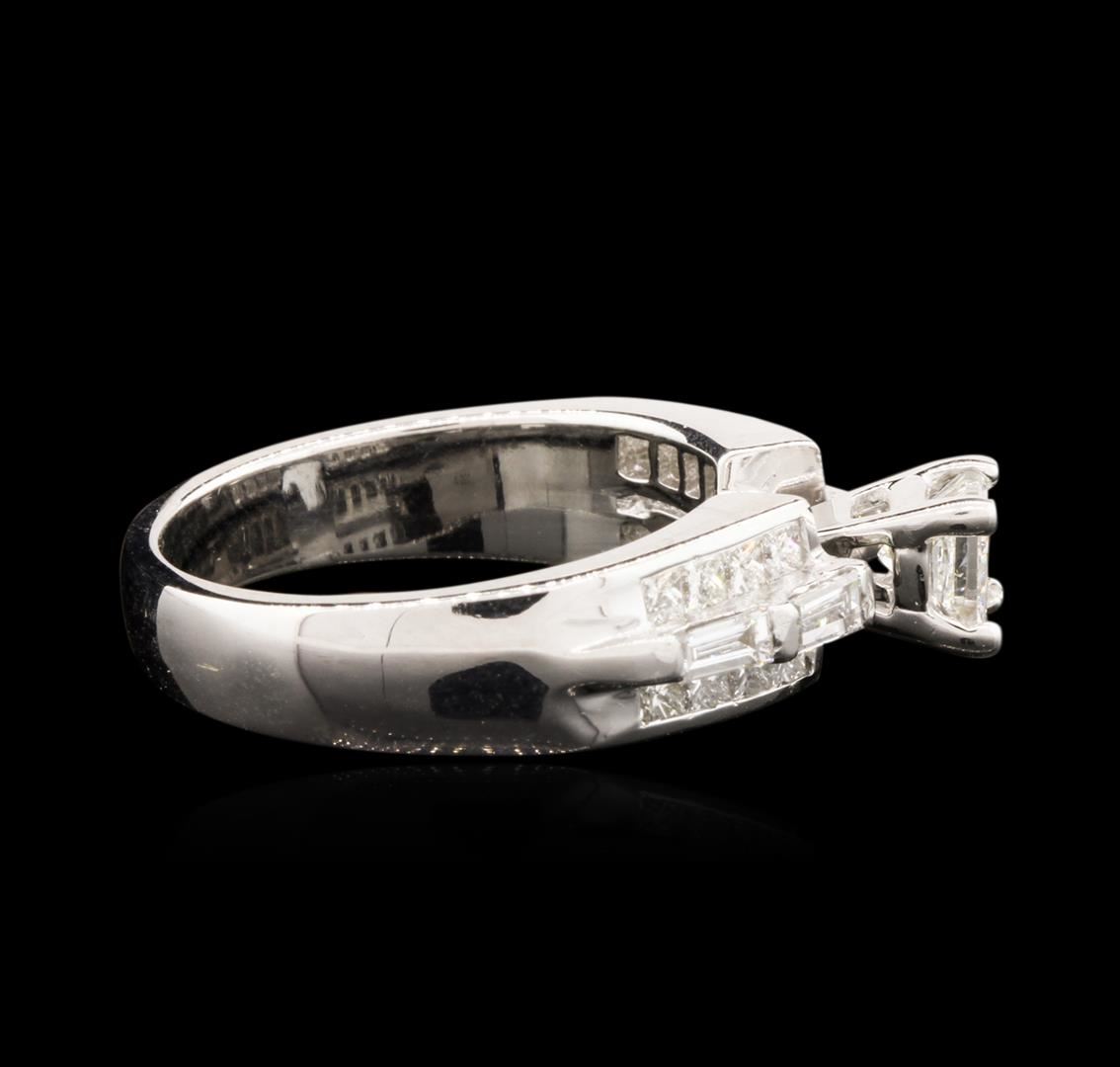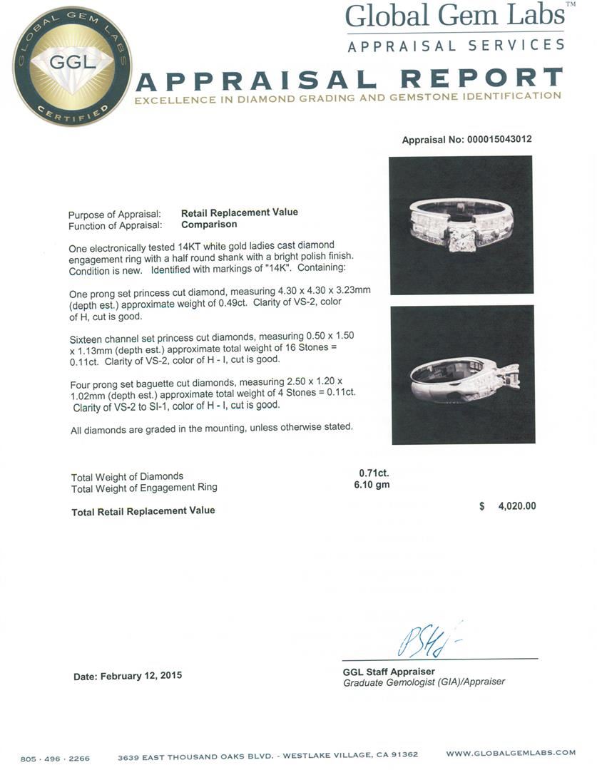 One electronically tested 14KT white gold ladies cast diamond engagement ring with a half round shank with a bright polish finish. Identified with markings of "14K". Condition is new. Containing: One prong set princess cut diamond, measuring 4.30 x 4.30 x 3.23mm (depth est.) approximate weight of 0.49ct. Clarity: VS-2. Color: H, Cut is Good. Sixteen channel set princess cut diamonds, measuring 0.50 x 1.50 x 1.13mm (depth est.) approximate total weight of 16 Stones = 0.11ct. Clarity: VS-2. Color: H - I, Cut is Good. Four prong set baguette cut diamonds, measuring 2.50 x 1.20 x 1.02mm (depth est.) approximate total weight of 4 Stones = 0.11ct. Clarity: VS-2 to SI-1. Color: H - I, Cut is Good. All diamonds are graded in the mounting, unless otherwise stated. Total Weight of Diamonds 0.71ct. Total Weight of Engagement Ring 6.10 grams. GGL Appraised at $4,020.00.