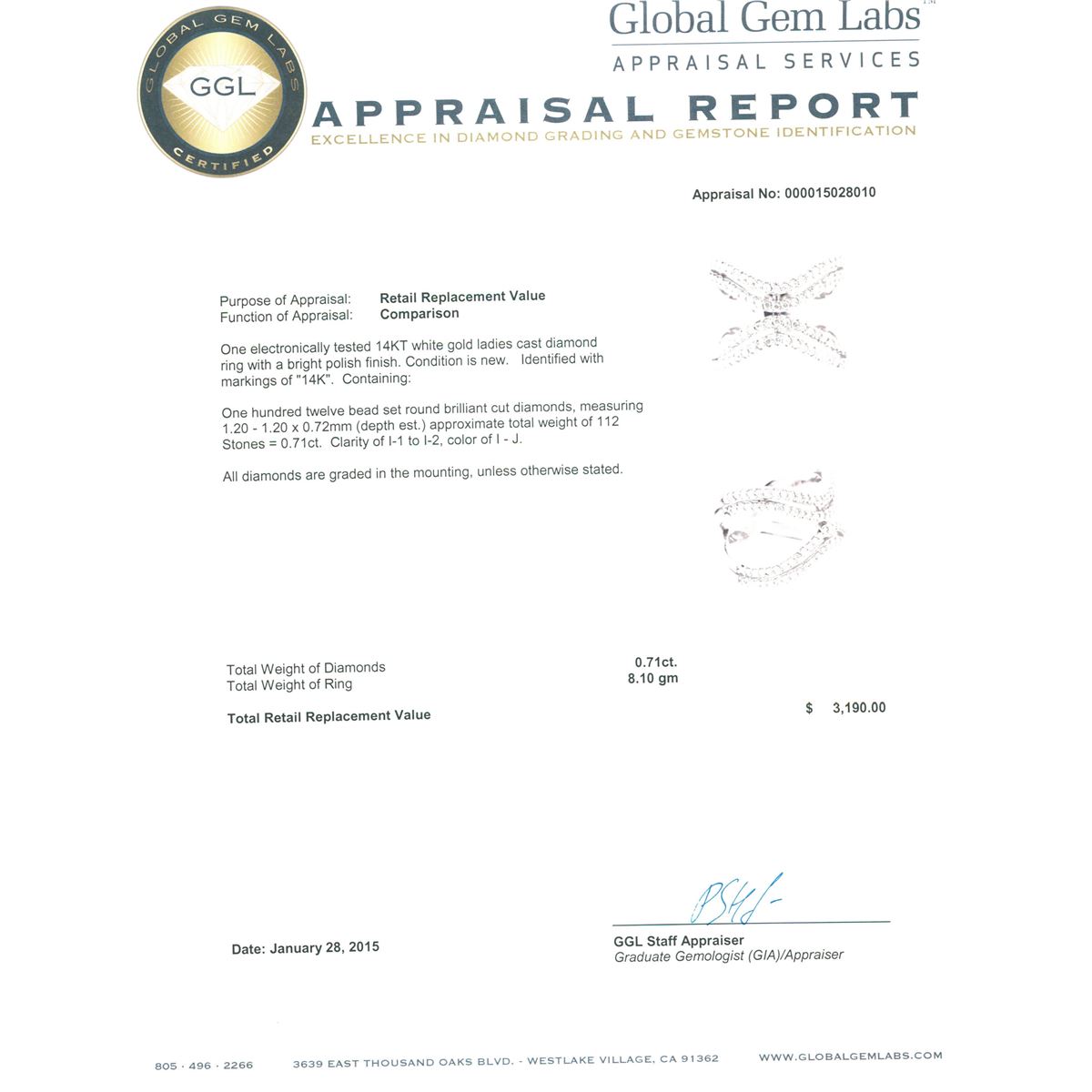 One electronically tested 14KT white gold ladies cast diamond ring with a bright polish finish. Identified with markings of "14K". Condition is new. Containing: One Hundred Twelve bead set round brilliant cut diamonds, measuring 1.20 - 1.20 x 0.72mm (depth est.) approximate total weight of 112 Stones = 0.71ct. Clarity: I-1 to I-2. Color: I - J. All diamonds are graded in the mounting, unless otherwise stated. Total Weight of Diamonds 0.71ct. Total Weight of Ring 8.10 grams. GGL Appraised at $3,190.00.