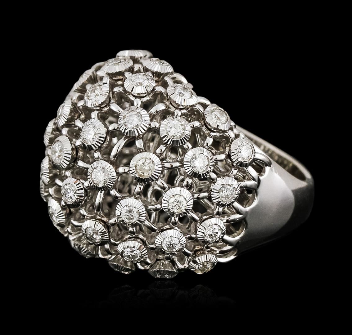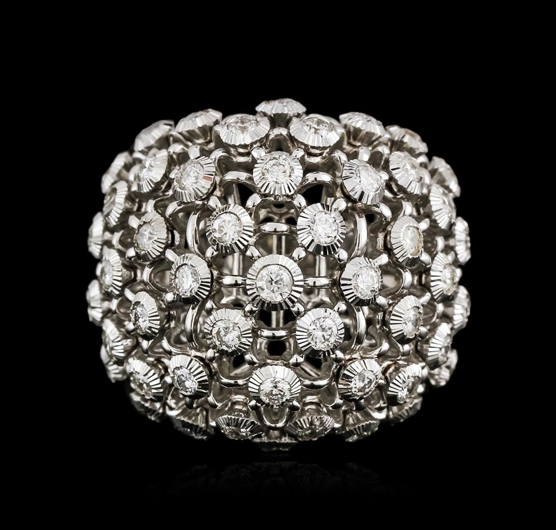 One electronically tested 14KT white gold ladies cast diamond ring with a bright polish finish. Identified with markings of "14K". Condition is new. Containing: Forty bezel set round brilliant cut diamonds, measuring 1.70 - 1.70 x 1.02mm (depth est.) approximate total weight of 40 Stones = 0.72ct. Clarity: SI-1 to SI-2. Color: I - J. All diamonds are graded in the mounting, unless otherwise stated. Total Weight of Diamonds 0.72ct. Total Weight of Ring 16.50 grams. GGL Appraised at $5,540.00.