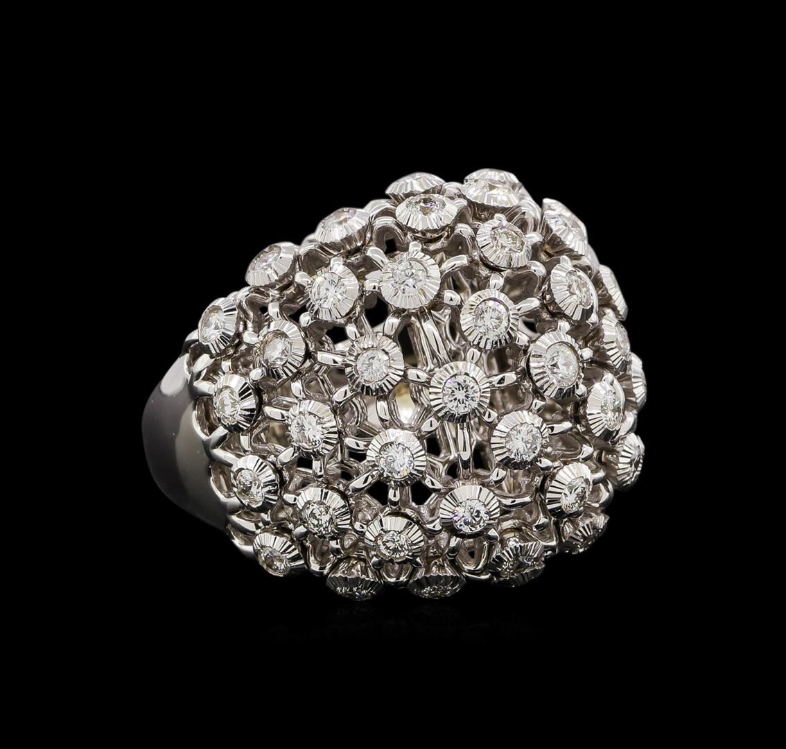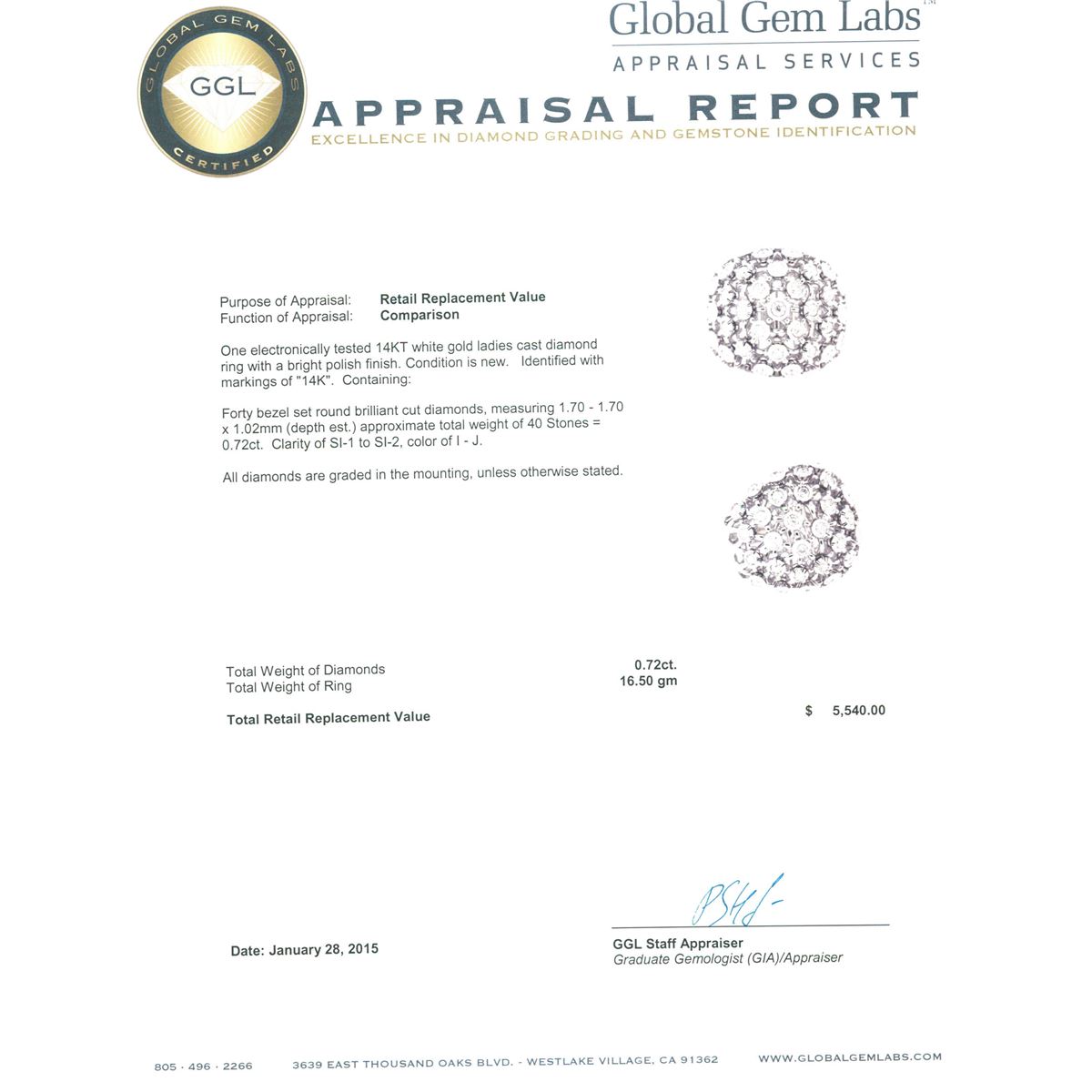 One electronically tested 14KT white gold ladies cast diamond ring with a bright polish finish. Identified with markings of "14K". Condition is new. Containing: Forty bezel set round brilliant cut diamonds, measuring 1.70 - 1.70 x 1.02mm (depth est.) approximate total weight of 40 Stones = 0.72ct. Clarity: SI-1 to SI-2. Color: I - J. All diamonds are graded in the mounting, unless otherwise stated. Total Weight of Diamonds 0.72ct. Total Weight of Ring 16.50 grams. GGL Appraised at $5,540.00.