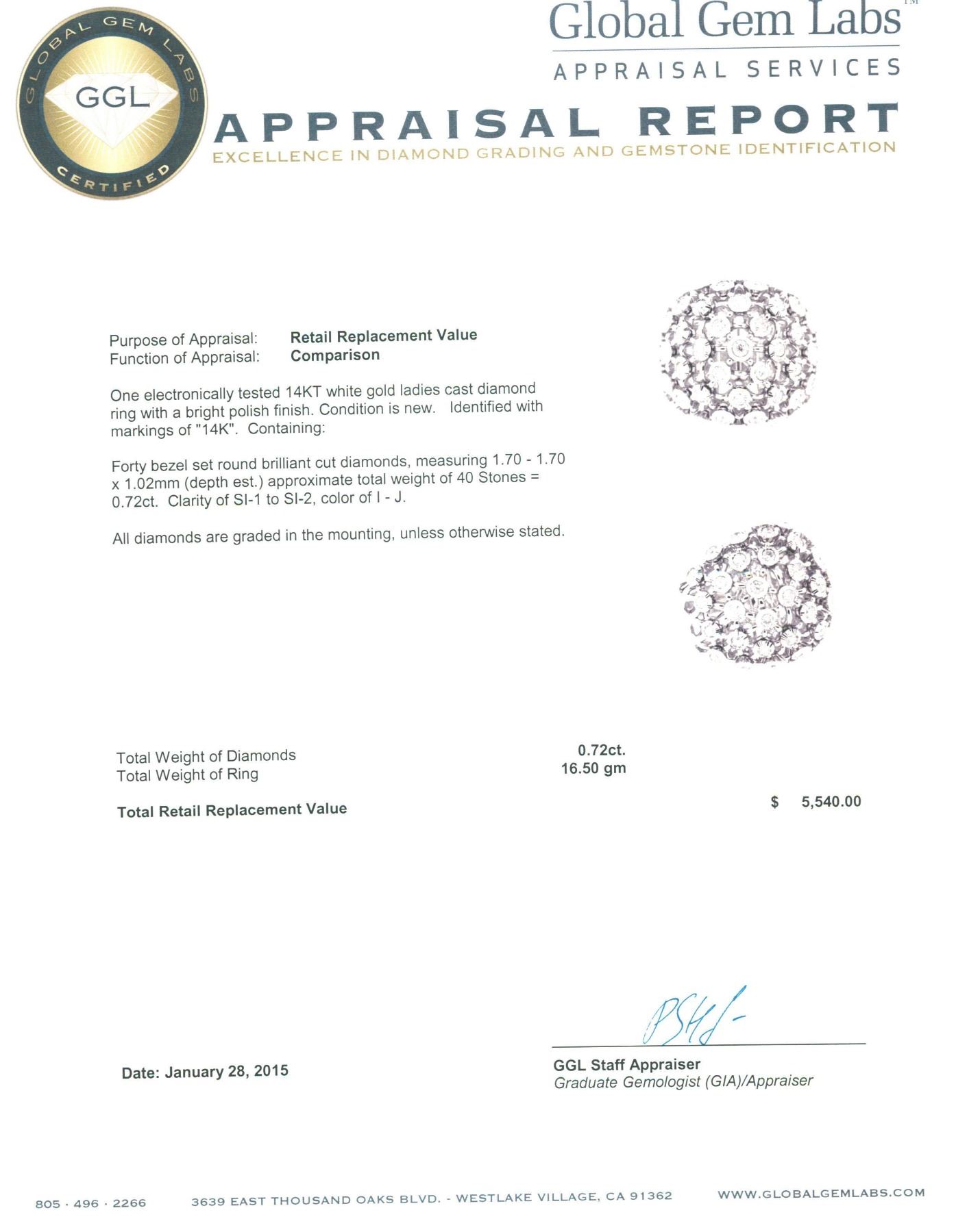 One electronically tested 14KT white gold ladies cast diamond ring with a bright polish finish. Identified with markings of "14K". Condition is new. Containing: Forty bezel set round brilliant cut diamonds, measuring 1.70 - 1.70 x 1.02mm (depth est.) approximate total weight of 40 Stones = 0.72ct. Clarity: SI-1 to SI-2. Color: I - J. All diamonds are graded in the mounting, unless otherwise stated. Total Weight of Diamonds 0.72ct. Total Weight of Ring 16.50 grams. GGL Appraised.
