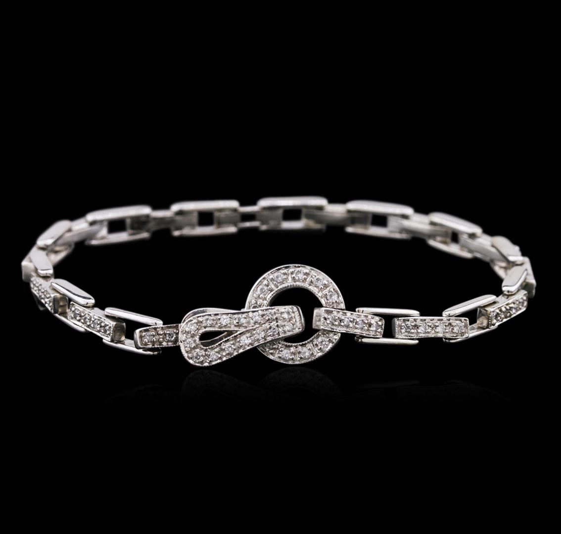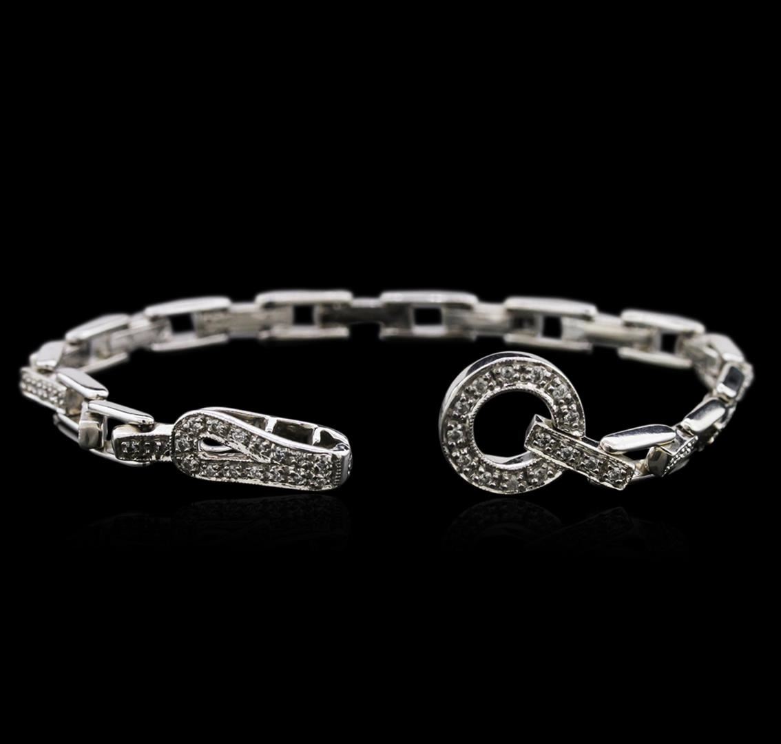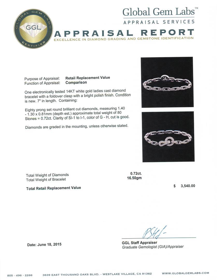 One electronically tested 14KT white gold ladies cast diamond bracelet with a foldover clasp with a bright polish finish. 7" in length. Condition is new. Containing: Eighty prong set round brilliant cut diamonds, measuring 1.40 - 1.30 x 0.81mm (depth est.) approximate total weight of 80 Stones = 0.72ct. Clarity: SI-1 to I-1. Color: G - H, Cut is Good. Diamonds are graded in the mounting, unless otherwise stated. Total Weight of Diamonds 0.72ct. Total Weight of Bracelet 16.50 grams. GGL Appraised at $3,540.00.