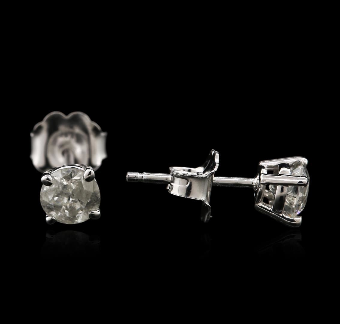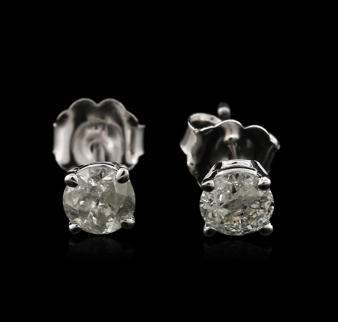 One pair electronically tested 14KT white gold ladies cast diamond stud earrings with friction posts with a bright polish finish. Identified with markings of "14K". Condition is new. Containing: Two prong set round brilliant cut diamonds, measuring 4.60 - 4.60 x 2.78mm (depth est.) approximate total weight of 2 Stones = 0.72ct. Clarity: I-3 to I-3. Color: J, Cut is Good. Diamonds are graded in the mounting, unless otherwise stated. Total Weight of Diamonds 0.72ct. Total Weight of Stud Earrings 0.80 grams. GGL Appraised at $895.00.