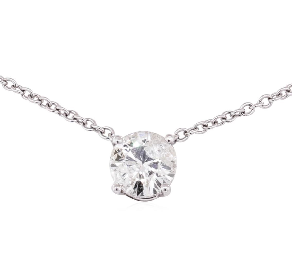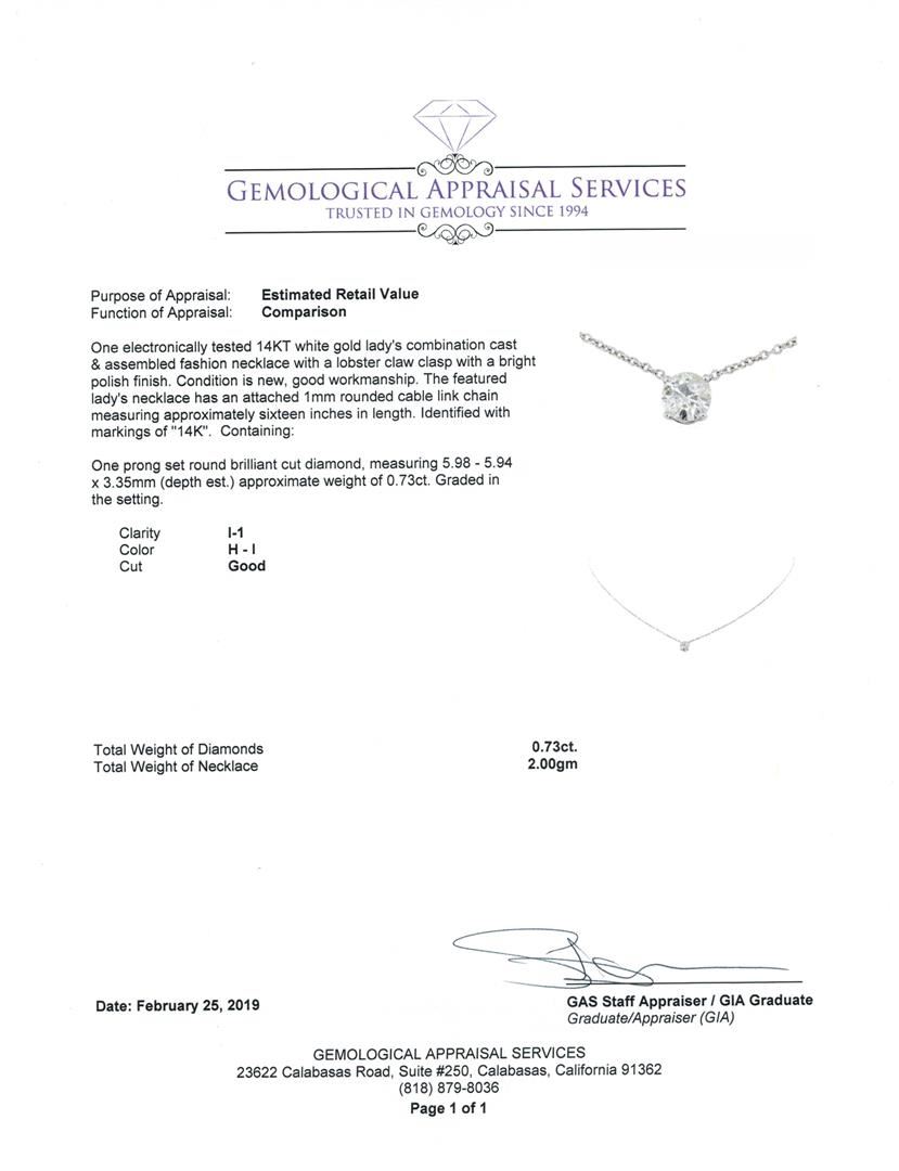 One electronically tested 14KT white gold lady's combination cast & assembled fashion necklace with a lobster claw clasp with a bright polish finish. The featured lady's necklace has an attached 1mm rounded cable link chain measuring approximately sixteen inches in length. Identified with markings of '14K'. Condition is new, good workmanship. Containing: One prong set round brilliant cut diamond, measuring 5.98 - 5.94 x 3.35mm (depth est.) approximate weight of 0.73ct. Graded in the setting. Color H - I, Clarity I-1, Cut Good. Total Weight of Diamonds 0.73ct. Total Weight of Necklace 2.00gm. GAS Appraised.