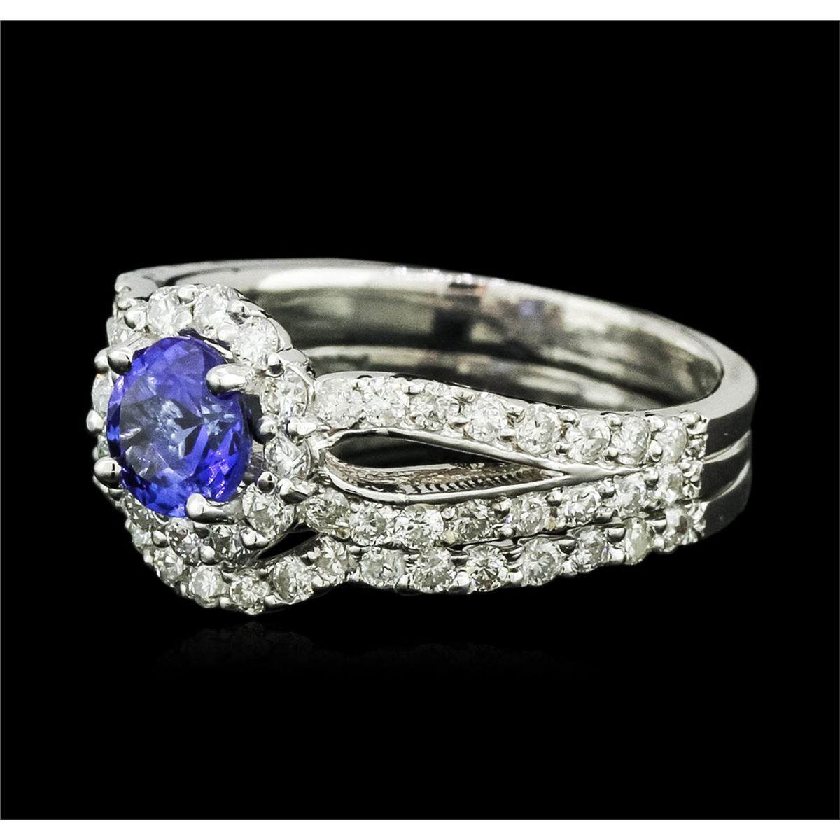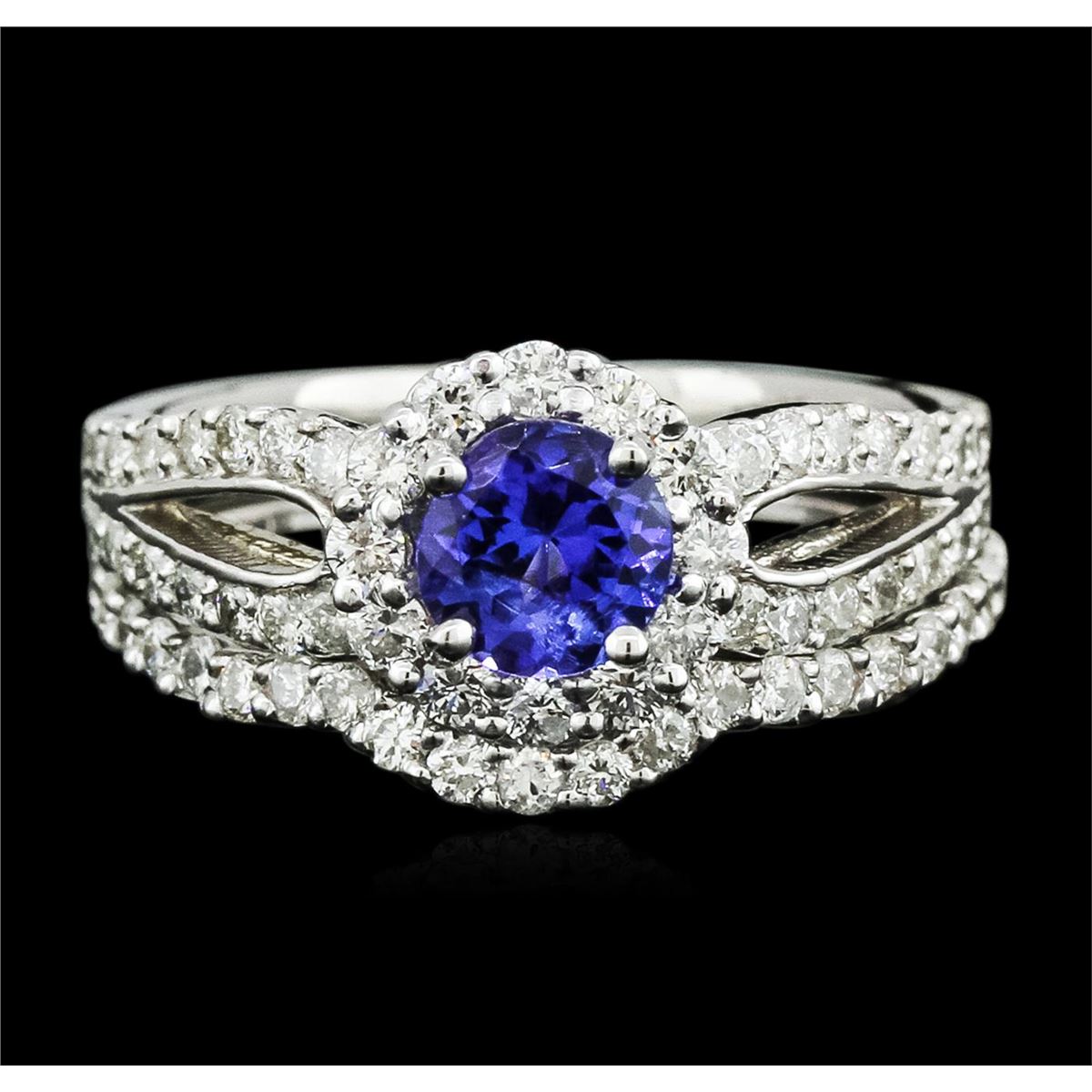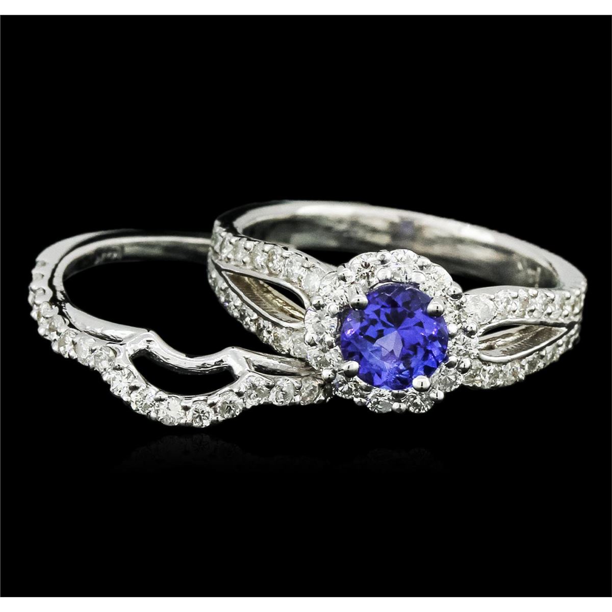 One electronically tested 14KT white gold ladies cast tanzanite and diamond engagement ring & guard set with a bright polish finish. Identified with markings of "14K". Condition is new. Containing: One prong set round modified brilliant cut natural tanzanite, measuring 5.50 - 5.50 x 3.58 mm, approximate weight of 0.73ct., clarity is eye clean, type I, medium, moderately strong, bluish violet color, (GIA bV 5/4), cut is good. Sixty-Five prong set round brilliant cut diamonds, measuring 1.30 - 1.30 x 0.78mm (depth est.) approximate total weight of 65 Stones = 0.52ct. Clarity: SI-2 to I-2. Color: I - J. Colored gemstones are presumed to have been subjected to commonly used enhancement processes. All diamonds and colored gemstones are graded in the mounting, unless otherwise stated. Total Weight of Colored Stones 0.73ct. Total Weight of Diamonds 0.52ct. Total Weight of Engagement Ring & Guard Set 5.40 grams. GGL Appraised at $3,765.00.