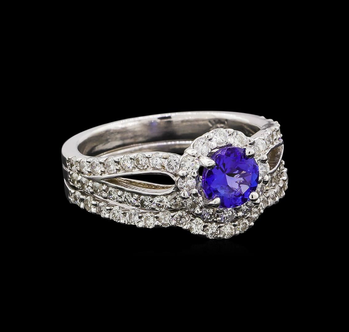 One electronically tested 14KT white gold ladies cast tanzanite and diamond engagement ring & guard set with a bright polish finish. Identified with markings of "14K". Condition is new. Containing: One prong set round modified brilliant cut natural tanzanite, measuring 5.50 - 5.50 x 3.58 mm, approximate weight of 0.73ct., clarity is eye clean, type I, medium, moderately strong, bluish violet color, (GIA bV 5/4), cut is good. Sixty-Five prong set round brilliant cut diamonds, measuring 1.30 - 1.30 x 0.78mm (depth est.) approximate total weight of 65 Stones = 0.52ct. Clarity: SI-2 to I-2. Color: I - J. Colored gemstones are presumed to have been subjected to commonly used enhancement processes. All diamonds and colored gemstones are graded in the mounting, unless otherwise stated. Total Weight of Colored Stones 0.73ct. Total Weight of Diamonds 0.52ct. Total Weight of Engagement Ring & Guard Set 5.40 grams. GGL Appraised at $3,765.00.