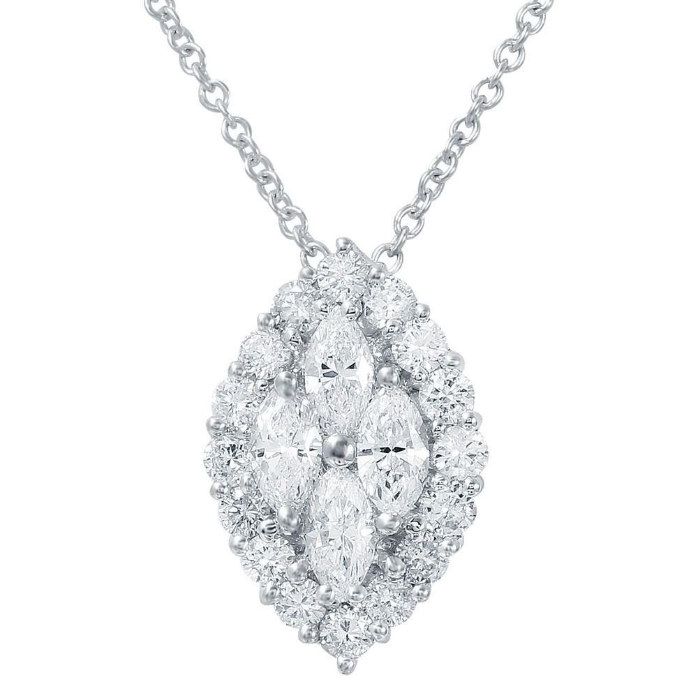 One 14KT White Gold 0.73ctw Diamond Pendant with Chain. (4) Marquise Diamonds with a total weight of 0.37cts. (16) Round Diamonds with a total weight of 0.36cts. Total weight of this pendant with chain is 2.18 grams. Total weight of this necklace is 2.18 grams.