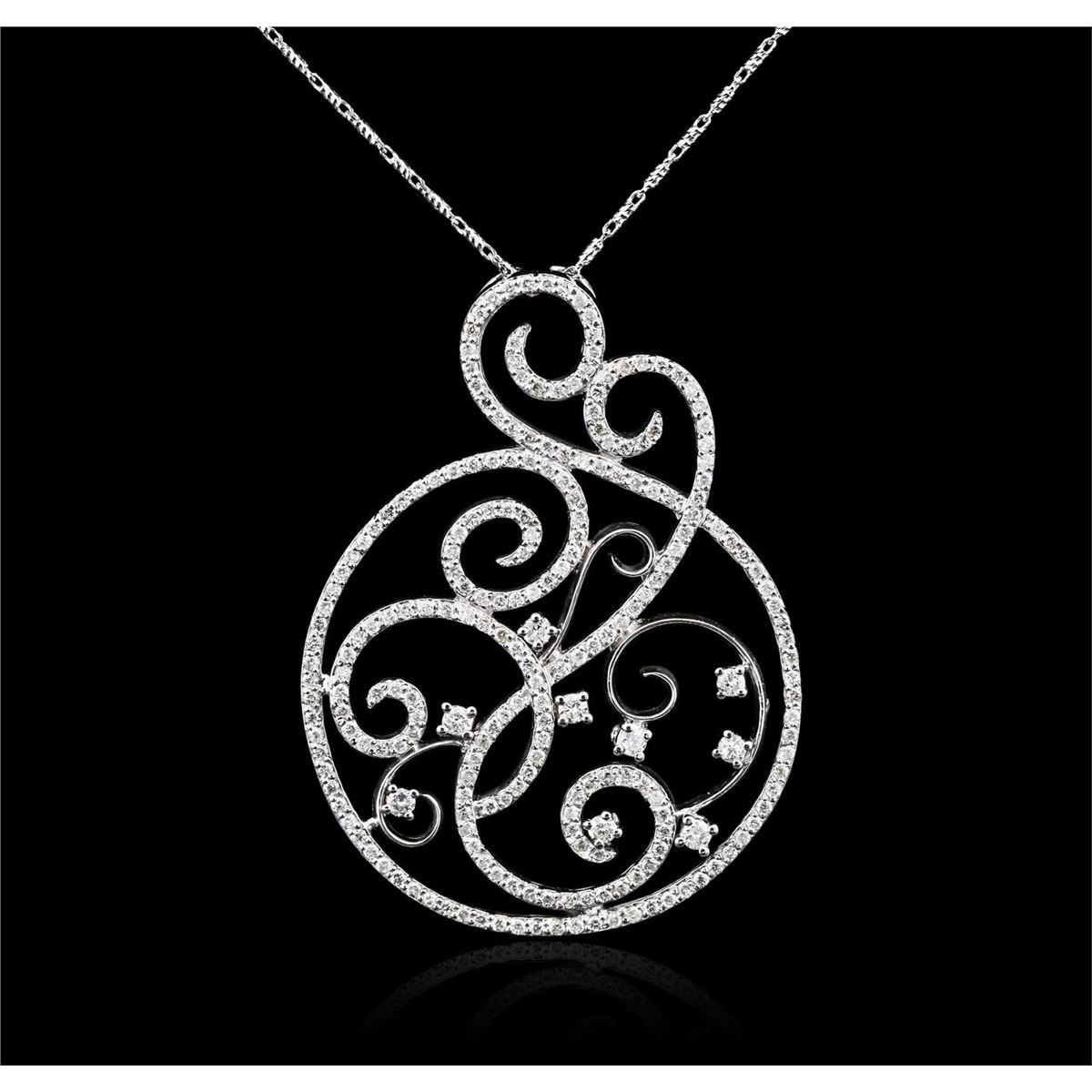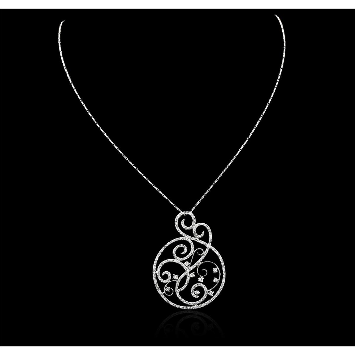 One electronically tested 14KT white gold ladies combination cast & assembled diamond pendant & chain 18.0" long, cable link with a lobster claw clasp with a bright polish finish. Identified with markings of "585". Condition is new. Containing: Nine prong set round brilliant cut diamonds, measuring 2.50 - 1.50 x 1.20mm (depth est.) approximate total weight of 9 Stones = 0.26ct. Clarity: SI-2 to I-1. Color: I - J, Cut is Good. One Hundred prong set round brilliant cut diamonds, measuring 1.10 - 1.10 x 0.66mm (depth est.) approximate total weight of 100 Stones = 0.48ct. Clarity: SI-2 to I-1. Color: I - J, Cut is Good. All diamonds are graded in the mounting, unless otherwise stated. Total Weight of Diamonds 0.74ct. Total Weight of Pendant & Chain 14.10 grams. GGL Appraised at $7,460.00.