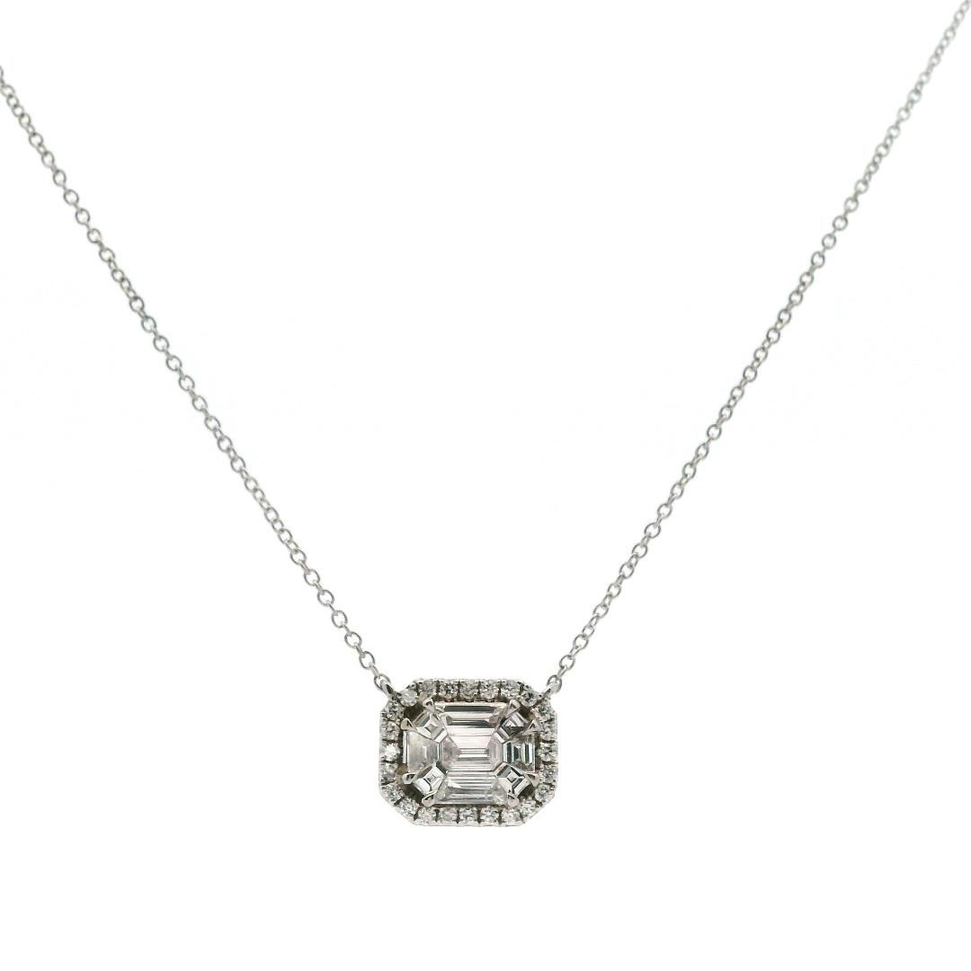 One electronically tested 14KT white gold lady's combination cast & assembled fashion halo pendant and chain 18.0" long, 1.0mm round cable link with a lobster claw clasp with emerald cut motif with a bright polish finish. Condition is new, good workmanshi GAS Appraised.