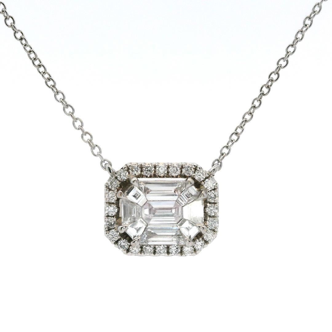 One electronically tested 14KT white gold lady's combination cast & assembled fashion halo pendant and chain 18.0" long, 1.0mm round cable link with a lobster claw clasp with emerald cut motif with a bright polish finish. Condition is new, good workmanshi GAS Appraised.