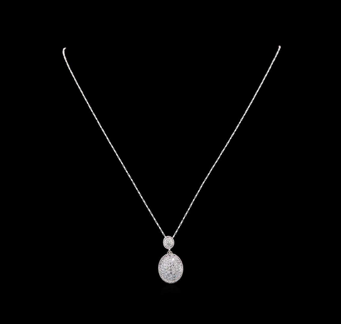 One electronically tested 14KT white gold ladies cast diamond pendant & chain 18.0" long, with a spring ring clasp with a bright polish finish. Identified with markings of "14K". Condition is new. Containing: Sixty-Three prong set round brilliant cut diamonds, measuring 1.60 - 1.30 x 0.87mm (depth est.) approximate total weight of 63 Stones = 0.75ct. Clarity: SI-1 to SI-2. Color: G - H, Cut is Good. All diamonds are graded in the mounting, unless otherwise stated. Total Weight of Diamonds 0.75ct. Total Weight of Pendant & Chain 7.40 grams. GGL Appraised at $3,450.00.