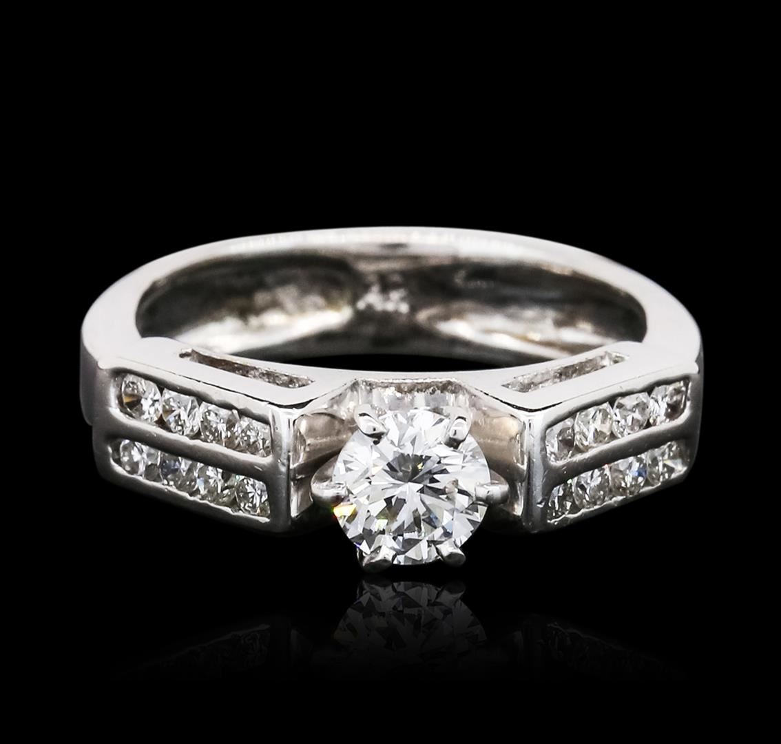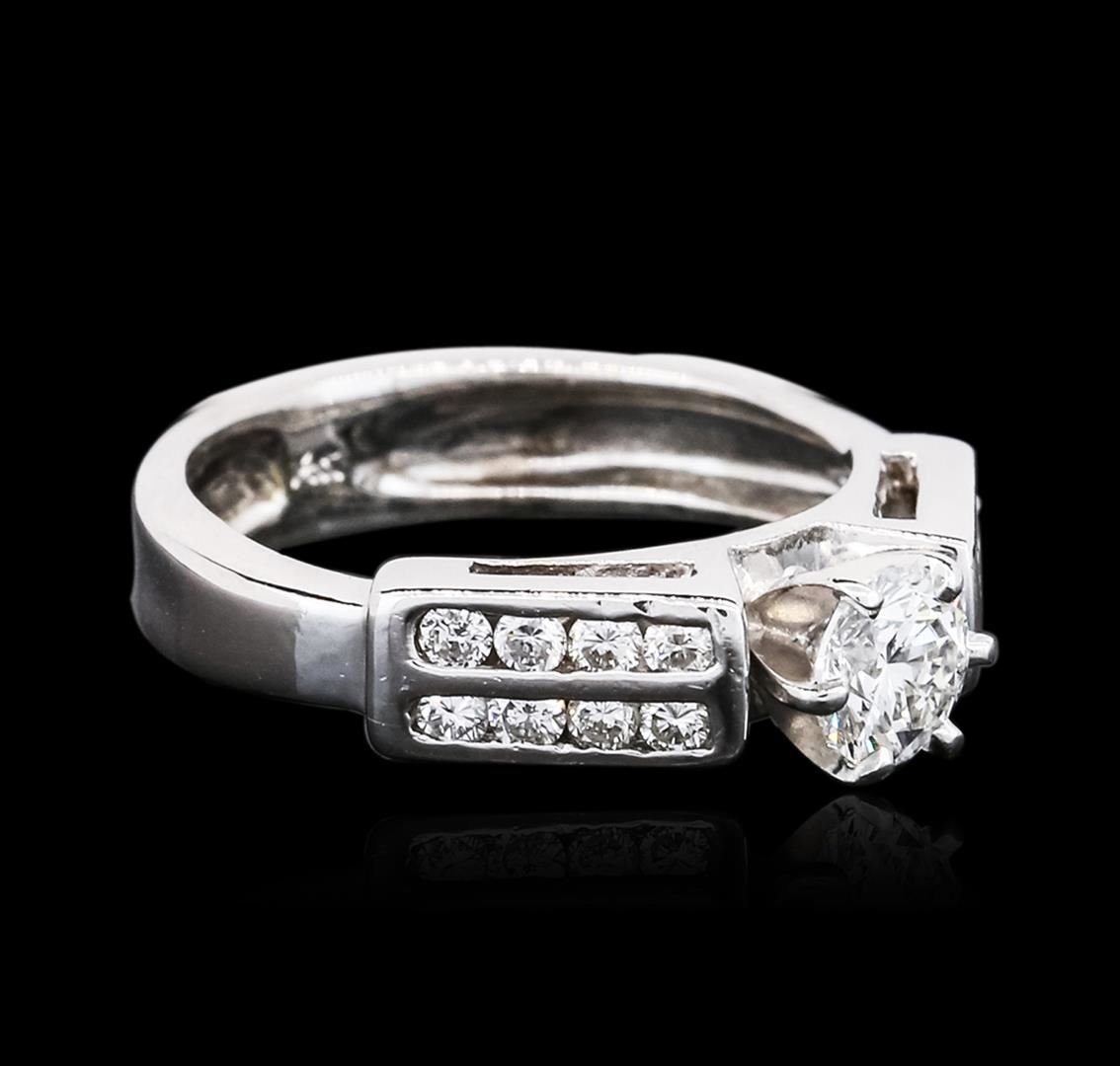 One ring featuring: 14KT white gold weighing 5.10 grams containing one round diamond center stone with a total weight of 0.46ct and round diamond side stones with a total weight of 0.29cts.