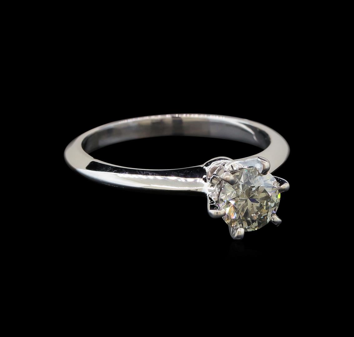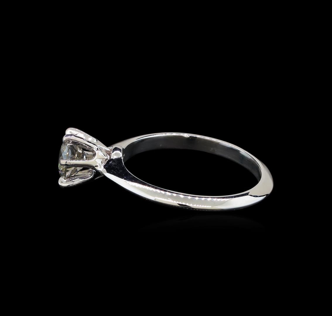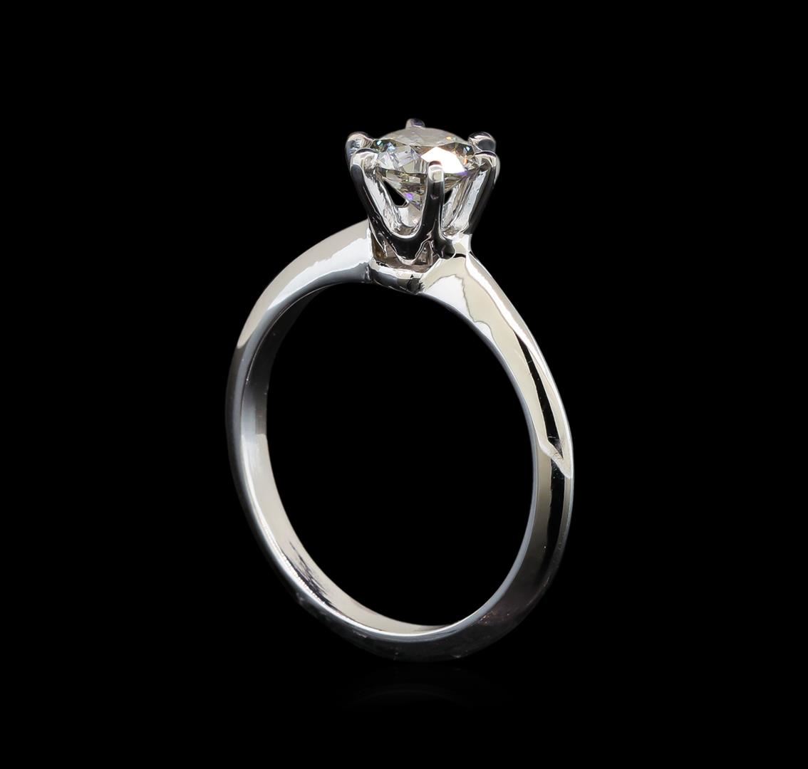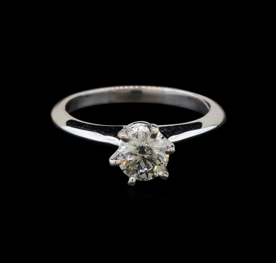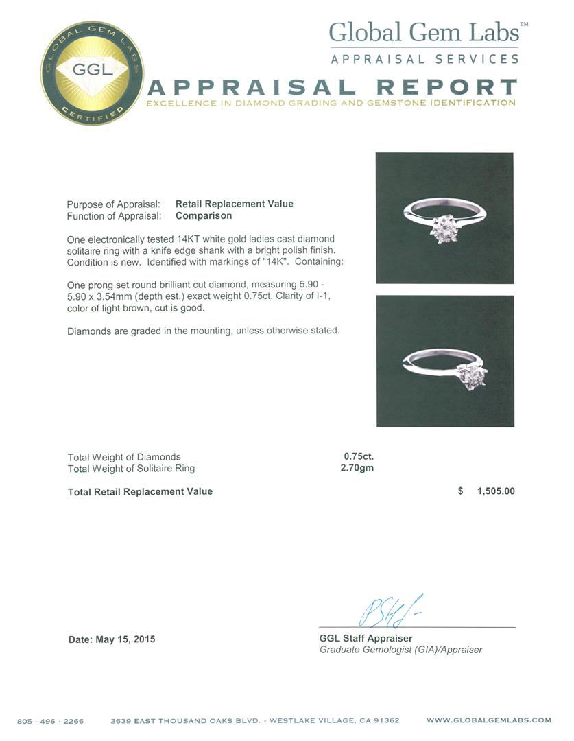 One electronically tested 14KT white gold ladies cast diamond solitaire ring with a knife edge shank with a bright polish finish. Identified with markings of "14K". Condition is new. Containing: One prong set round brilliant cut diamond, measuring 5.90 - 5.90 x 3.54mm (depth est.) exact weight 0.75ct. Clarity: I-1, Cut is Good. Diamonds are graded in the mounting, unless otherwise stated. Total Weight of Diamonds 0.75ct. Total Weight of Solitaire Ring 2.70 grams. GGL Appraised at $1,505.00.
