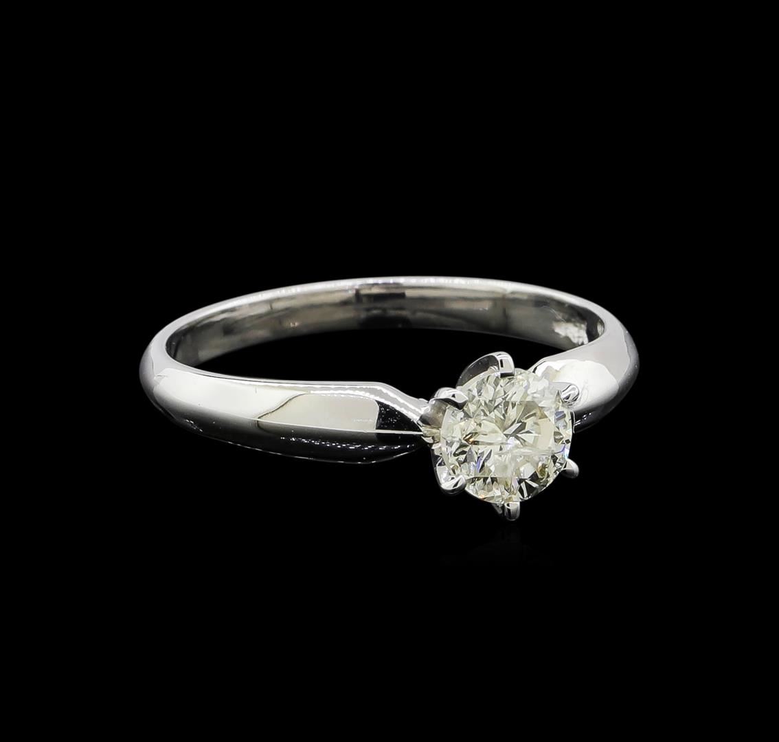 One electronically tested 14KT white gold ladies cast diamond solitaire ring with a knife edge shank with a bright polish finish. Identified with markings of "14K". Condition is new. Containing: One prong set round brilliant cut diamond, measuring 5.40 - 5.40 x 3.24mm (depth est.) exact weight 0.75ct. Clarity: I-1. Color: L, Cut is Good. Diamonds are graded in the mounting, unless otherwise stated. Total Weight of Diamonds 0.75ct. Total Weight of Solitaire Ring 2.50 grams. GGL Appraised at $1,800.00.