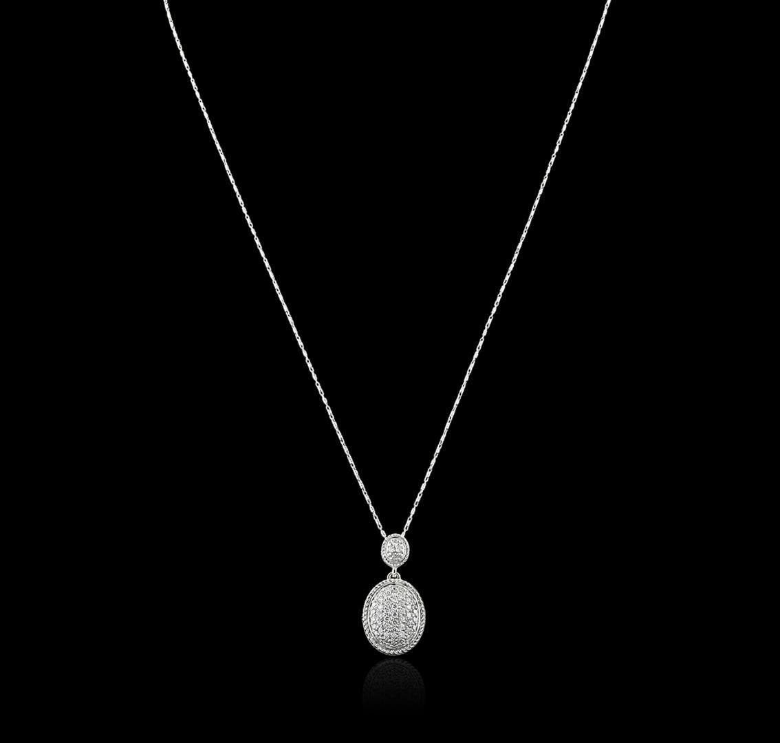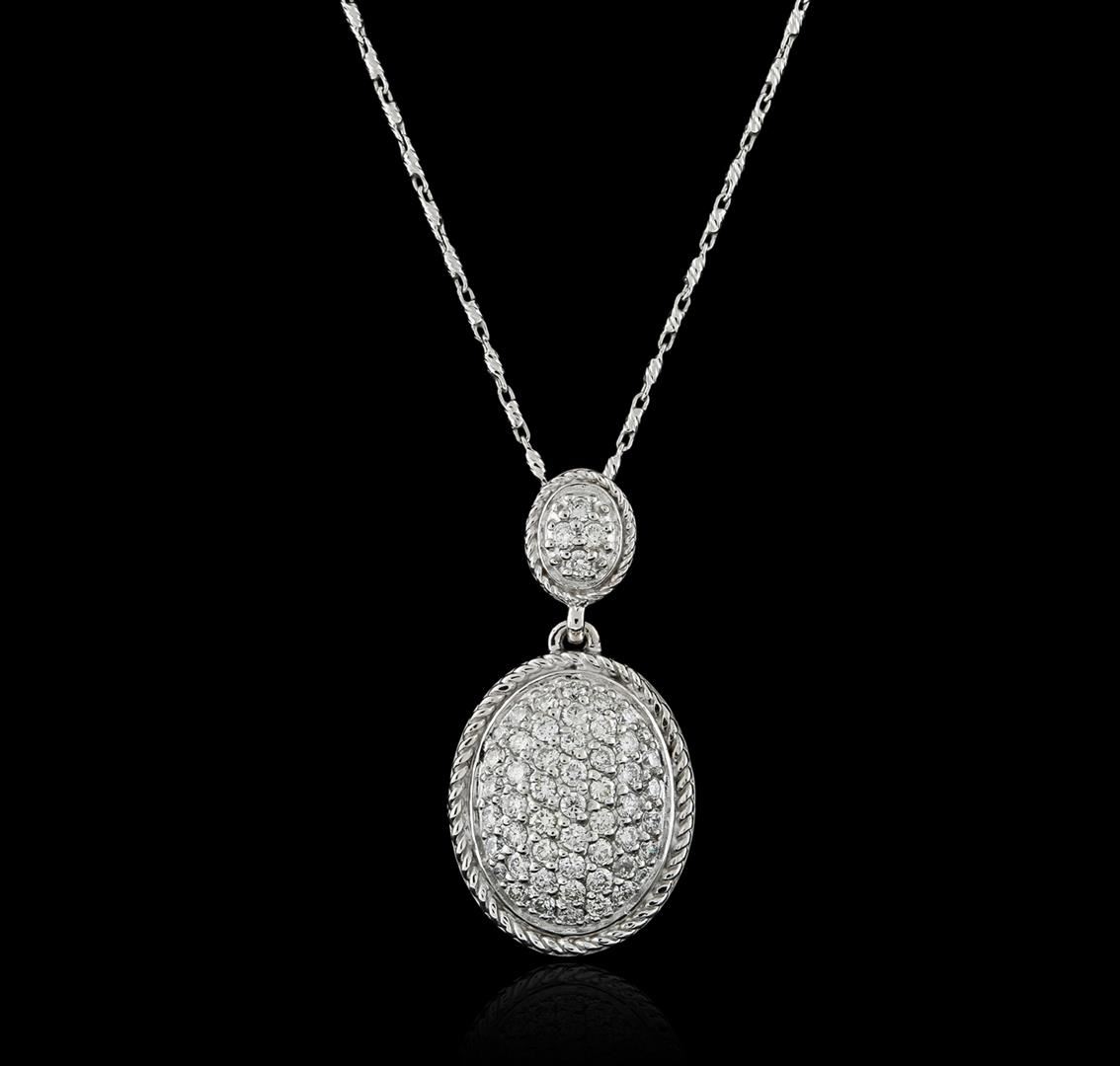 One electronically tested 14KT white gold ladies cast diamond pendant & chain 18.0" long, with a spring ring clasp with a bright polish finish. Identified with markings of "14K". Condition is new. Containing: Sixty-Three prong set round brilliant cut diamonds, measuring 1.60 - 1.30 x 0.87mm (depth est.) approximate total weight of 63 Stones = 0.75ct. Clarity: SI-1 to SI-2. Color: G - H, Cut is Good. All diamonds are graded in the mounting, unless otherwise stated. Total Weight of Diamonds 0.75ct. Total Weight of Pendant & Chain 7.40 grams. GGL Appraised at $3,450.00.
