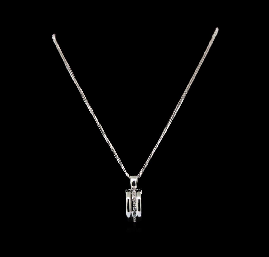 One electronically tested 14KT white gold ladies cast diamond pendant & chain 18.0" long, with a lobster claw clasp with a bright polish finish. Identified with markings of "585". Condition is new. Containing: Twenty-Seven channel set round brilliant cut diamonds, measuring 1.70 - 1.70 x 1.02mm (depth est.) approximate total weight of 27 Stones = 0.77ct. Clarity: SI-1 to SI-2. Color: H - I, Cut is Good. All diamonds are graded in the mounting, unless otherwise stated. Total Weight of Diamonds 0.77ct. Total Weight of Pendant & Chain 11.00 grams. GGL Appraised at $3,740.00.
