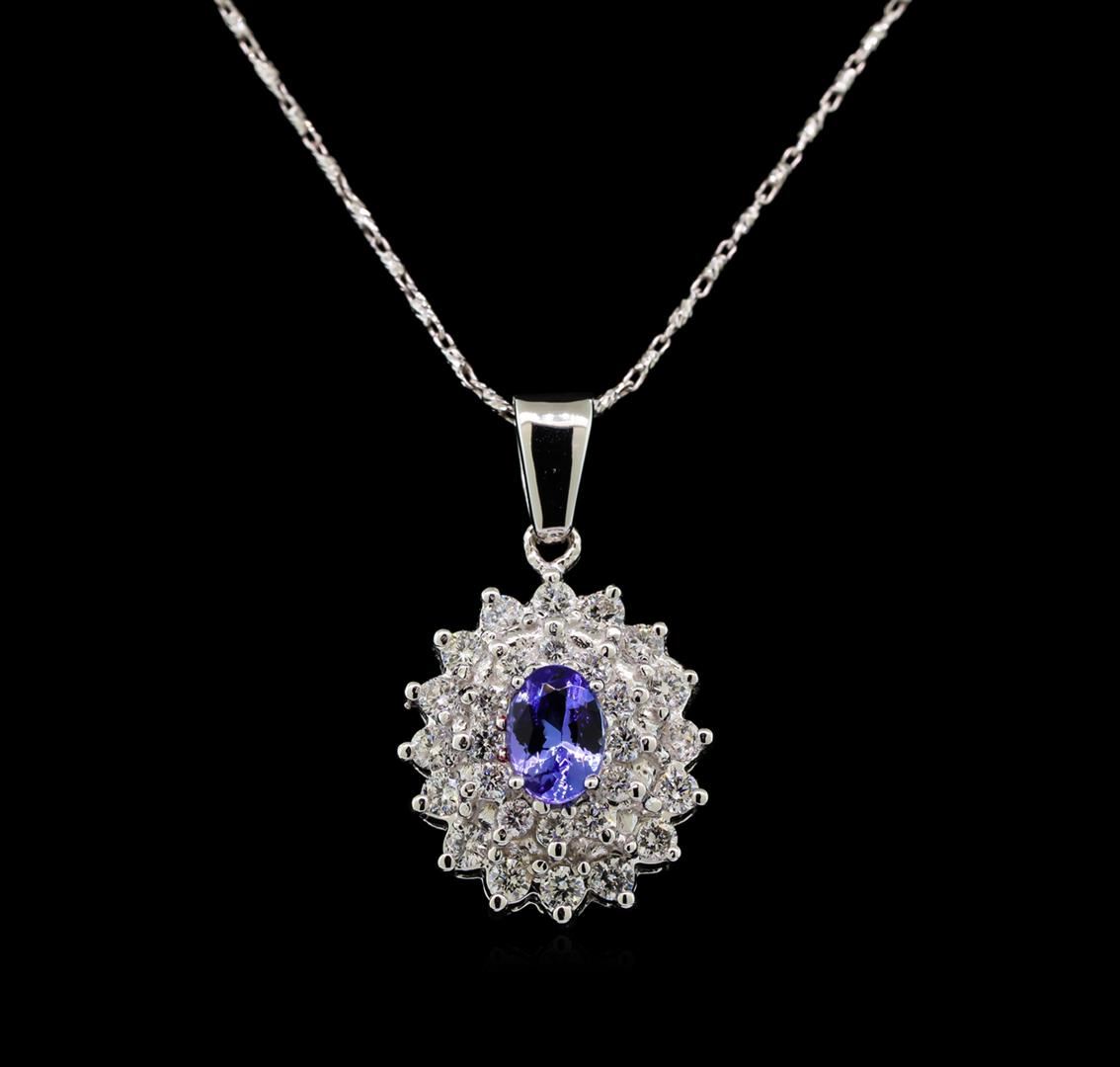 One electronically tested 14KT white gold ladies cast tanzanite and diamond pendant & chain 18.0" long, with a spring ring clasp with a bright polish finish. Identified with markings of "14K". Condition is new. Containing: One prong set oval modified brilliant cut natural tanzanite, measuring 7.30 x 4.80 x 3.12mm, approximate weight of 0.77ct., clarity is eye clean, type I, medium light, very slightly grayish, violet color, (GIA V 4/3), cut is good. Twenty-Eight prong set round brilliant cut diamonds, measuring 2.00 - 1.80 x 1.14mm (depth est.) approximate total weight of 28 Stones = 0.70ct. Clarity: SI-1 to SI-2. Color: I - J, Cut is Good. Colored gemstones are presumed to have been subjected to commonly used enhancement processes. All diamonds and colored gemstones are graded in the mounting, unless otherwise stated. Total Weight of Colored Stones 0.77ct. Total Weight of Diamonds 0.70ct. Total Weight of Pendant & Chain 6.80 grams. GGL Appraised at $4,090.00.