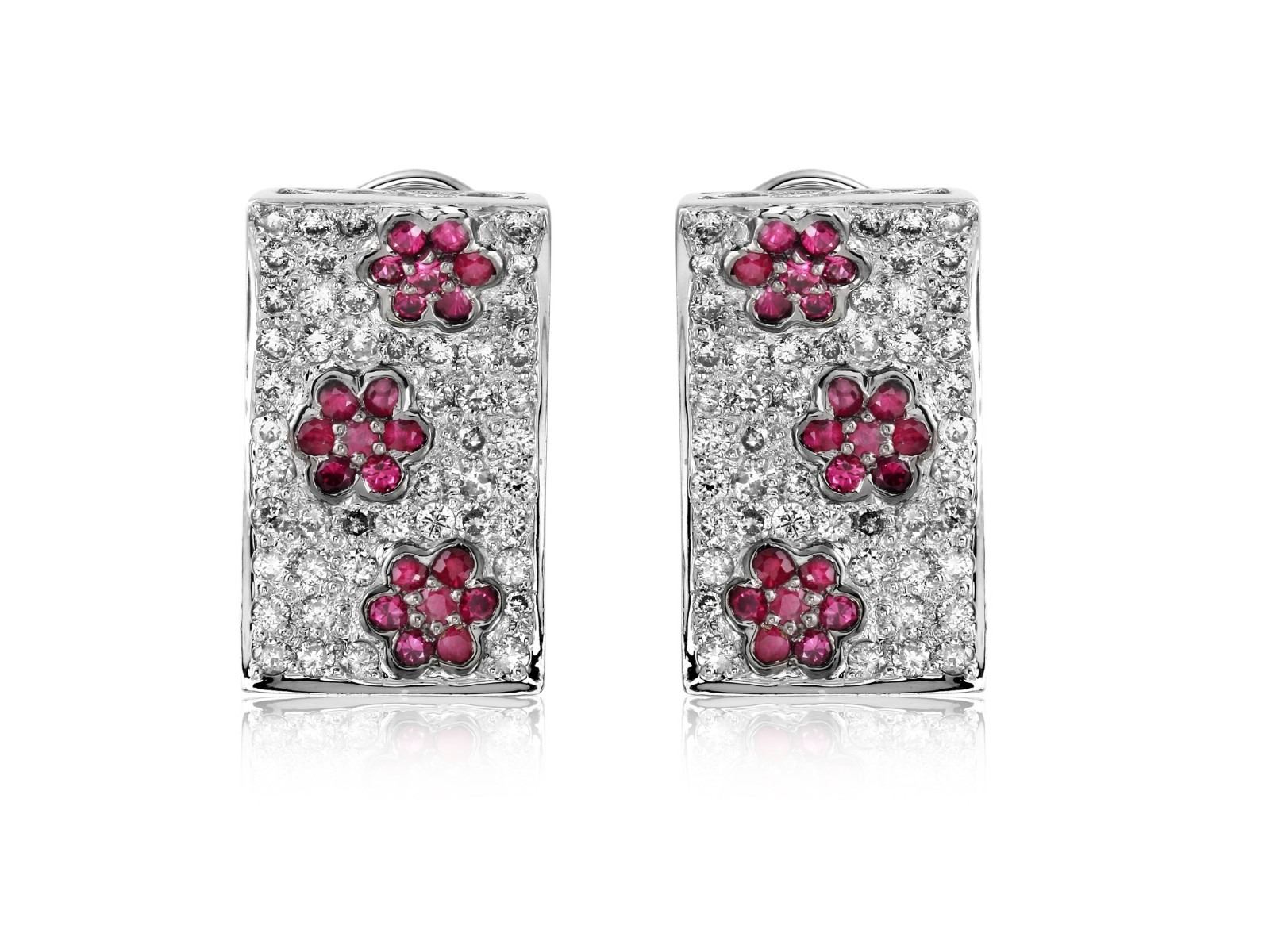 One 14KT White Gold 0.78ctw Ruby and Diamond Earrings. (42) Rubies with a total weight of 0.78cts. (94) Round Diamonds with a total weight of 1.13cts with a color of I and clarity of I-1. Total weight of these earrings are 9.3 grams.